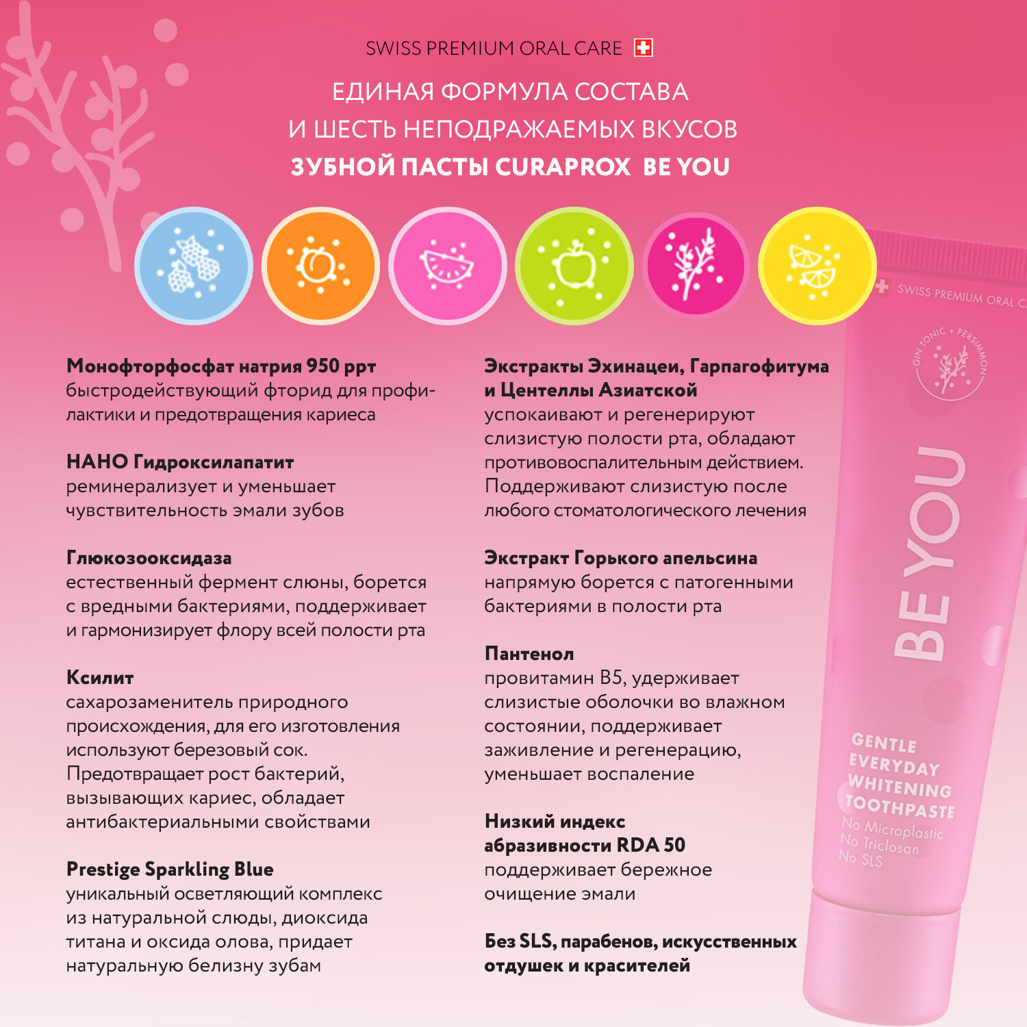 | Не содержит | искусственные ароматизаторы / искусственные подсластители / консерванты / красители / лаурилсульфат натрия (SLS) / ментол / мяту / парабены / триклозан / фтор / хлоргексидин |