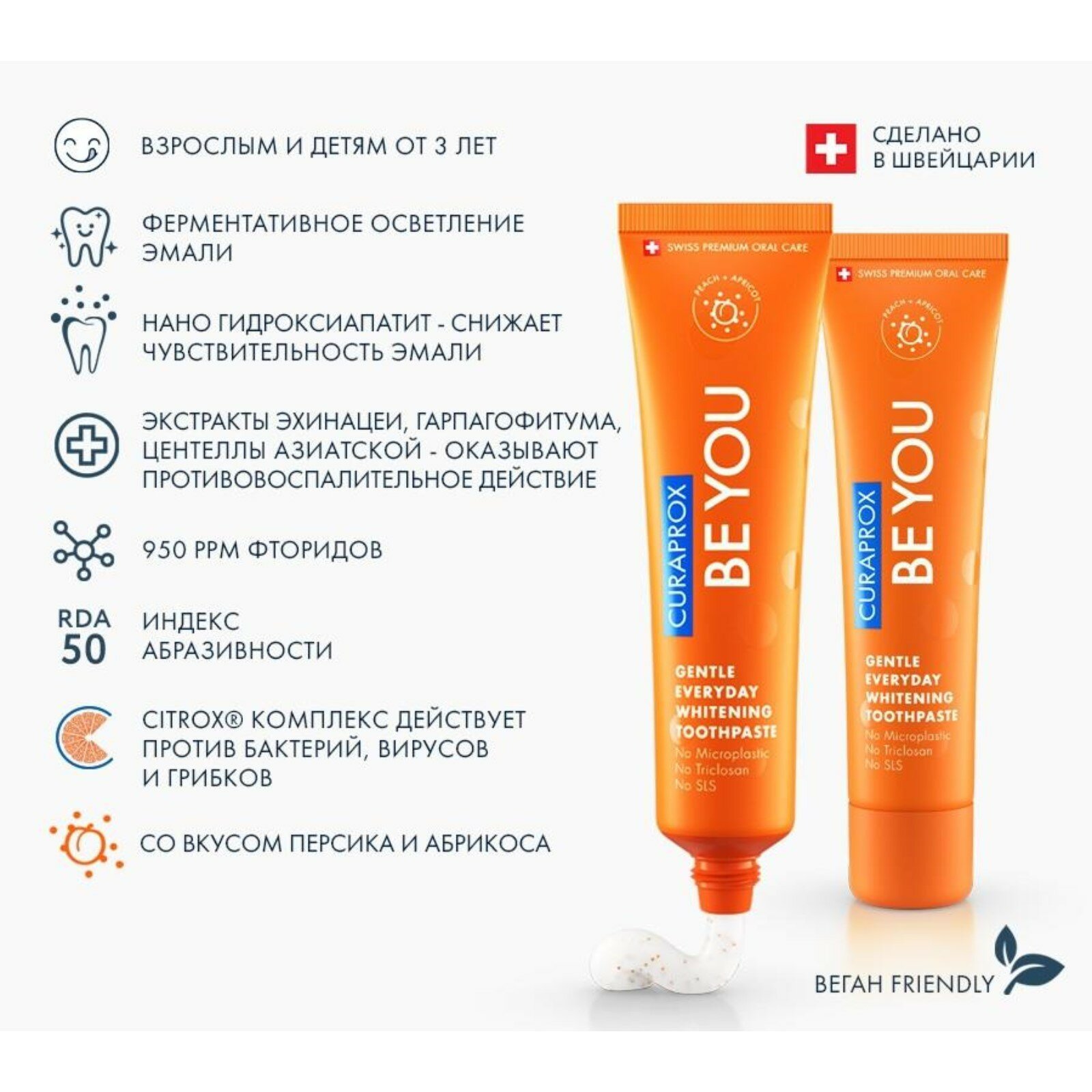 | Не содержит | искусственные ароматизаторы / искусственные подсластители / консерванты / красители / лаурилсульфат натрия (SLS) / ментол / мяту / парабены / триклозан / фтор / хлоргексидин |
