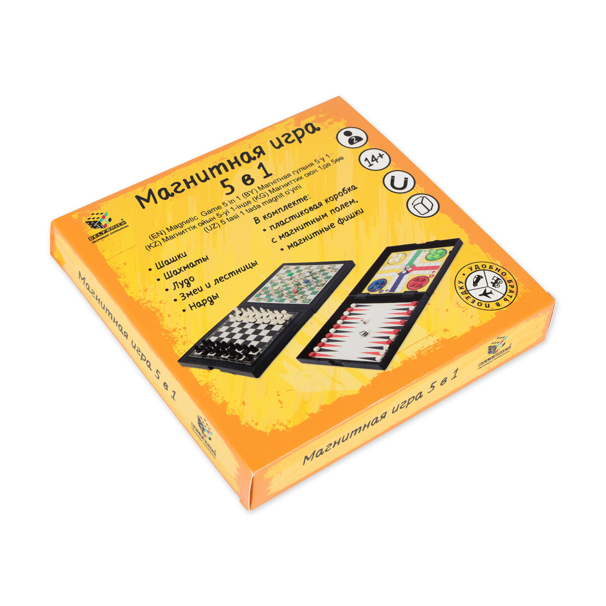 | Подробная комплектация | пластиковая коробка с магнитным полем, шахматные фигурки на магните, магнитные фишки, игральные кости |