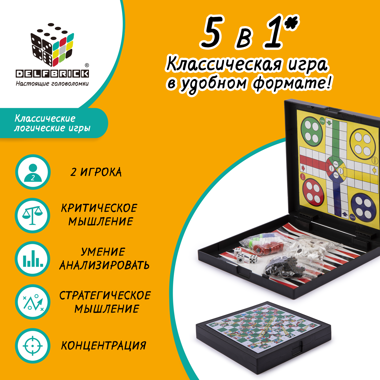 Магнитная игра 5 в 1 "DELFBRICK" DLN-03 Шашки, шахматы, лудо, змеи и лестницы, нарды интересное: