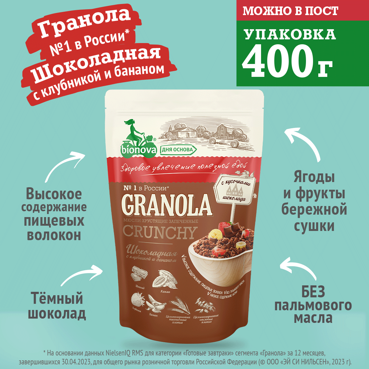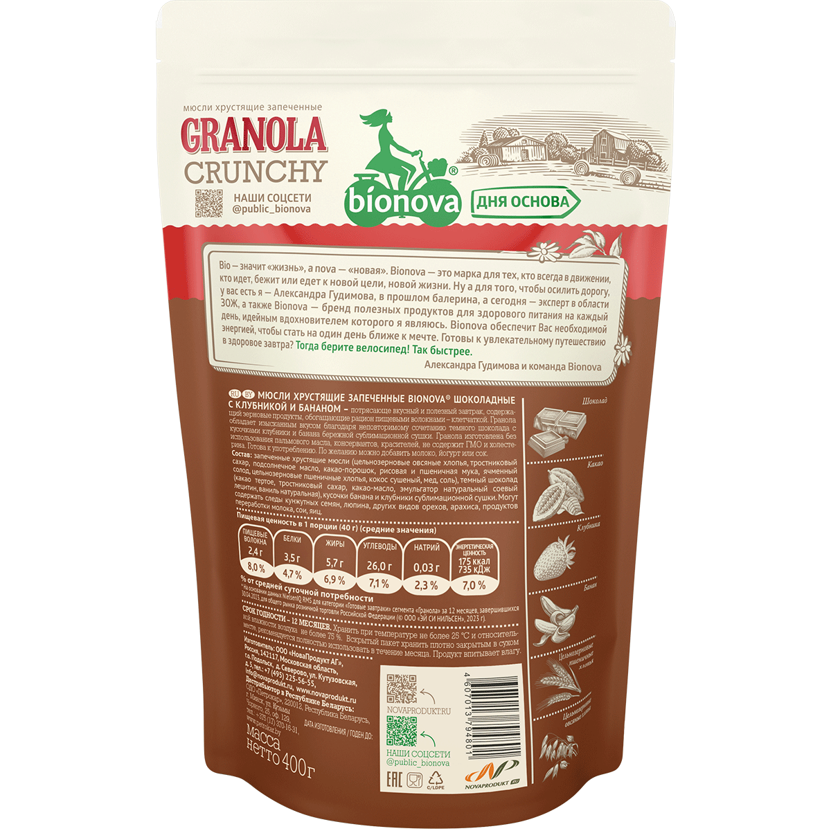 Bionova, Гранола "Шоколадная с клубникой и бананом", 400 гр
