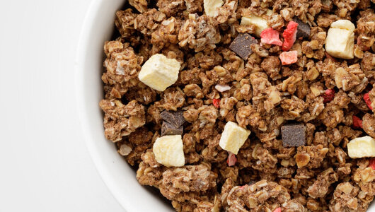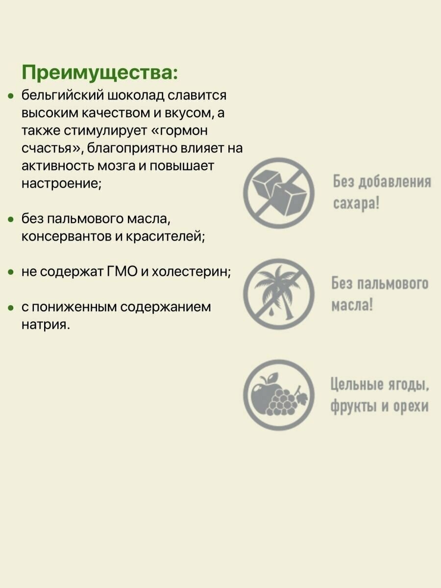 | Состав | запеченные хрустящие мюсли (цельнозерновые овсяные хлопья / тростниковый сахар / подсолнечное масло / кокос сушеный / пшеничная и рисовая мука / цельнозерновые пшеничные хлопья / какао-порошок / ячменный солод / мед / соль) / бельгийский темный шоколад (какао-тёртое / тросниковый сахар / какао-масло / эмульгатор натуральный соевый лецитин / ваниль натуральная) / кусочки банана и клубники сублимационной сушки |