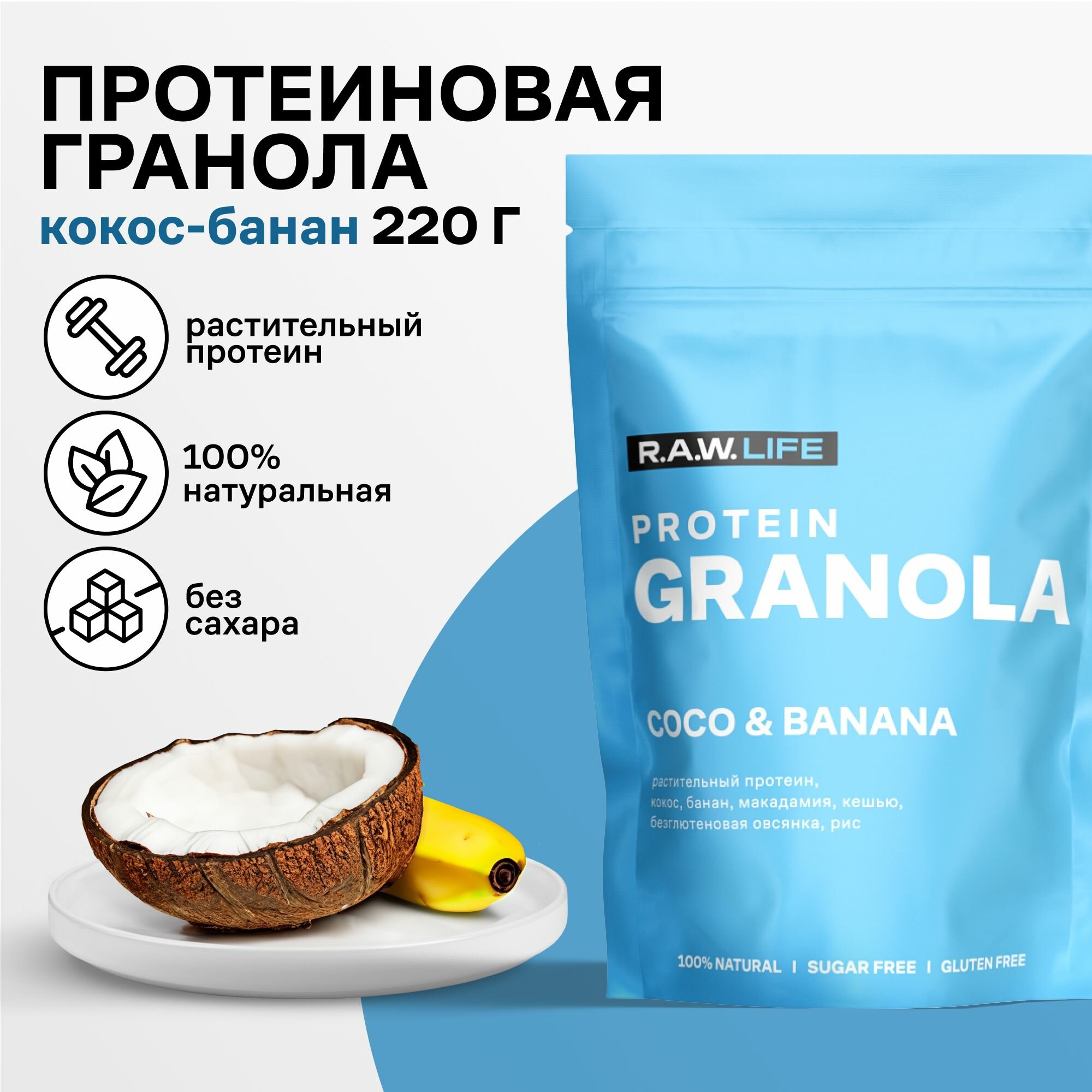 Купить Гранола протеиновая R.A.W. LIFE без сахара, без глютена / Натуральный готовый веганский продукт для здорового питания / Кокос-Банан 220гр