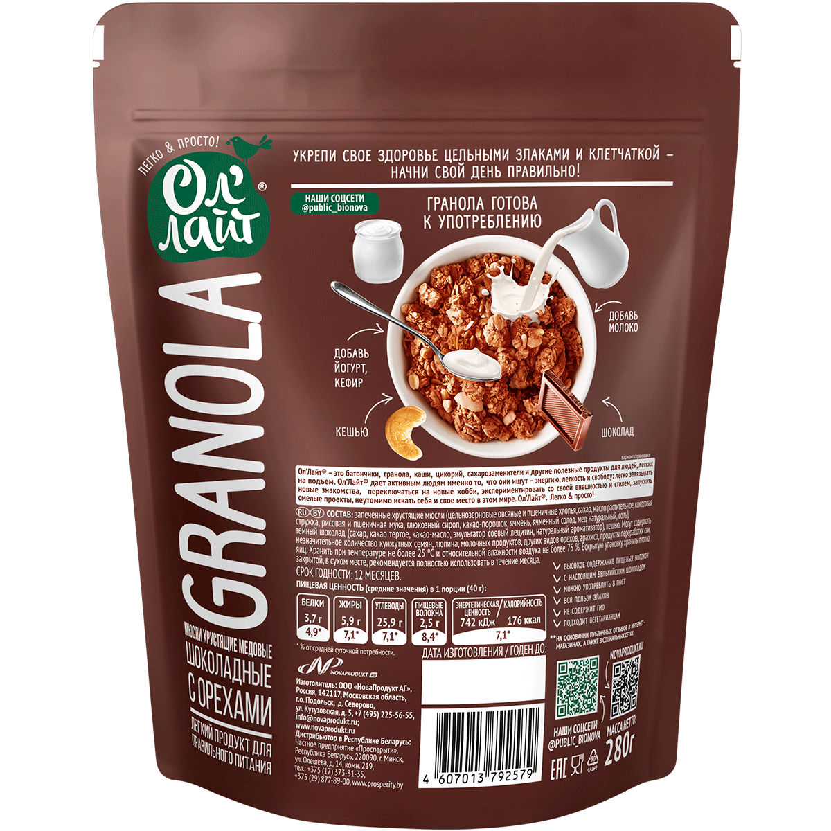 Мюсли медовые ОЛ'ЛАЙТ Granola, шоколадные с орехами, 280г