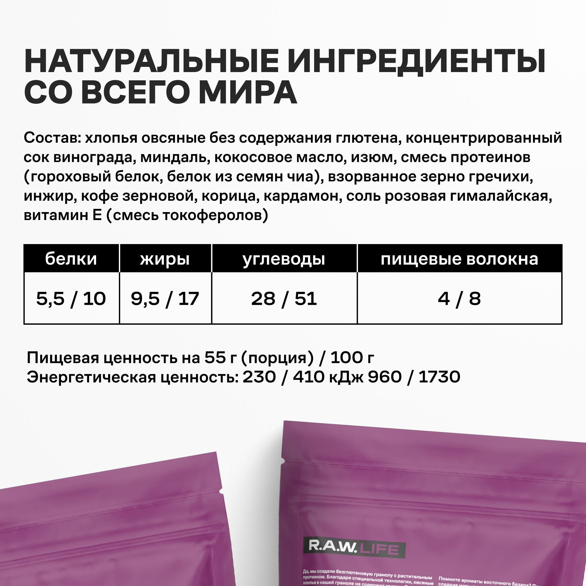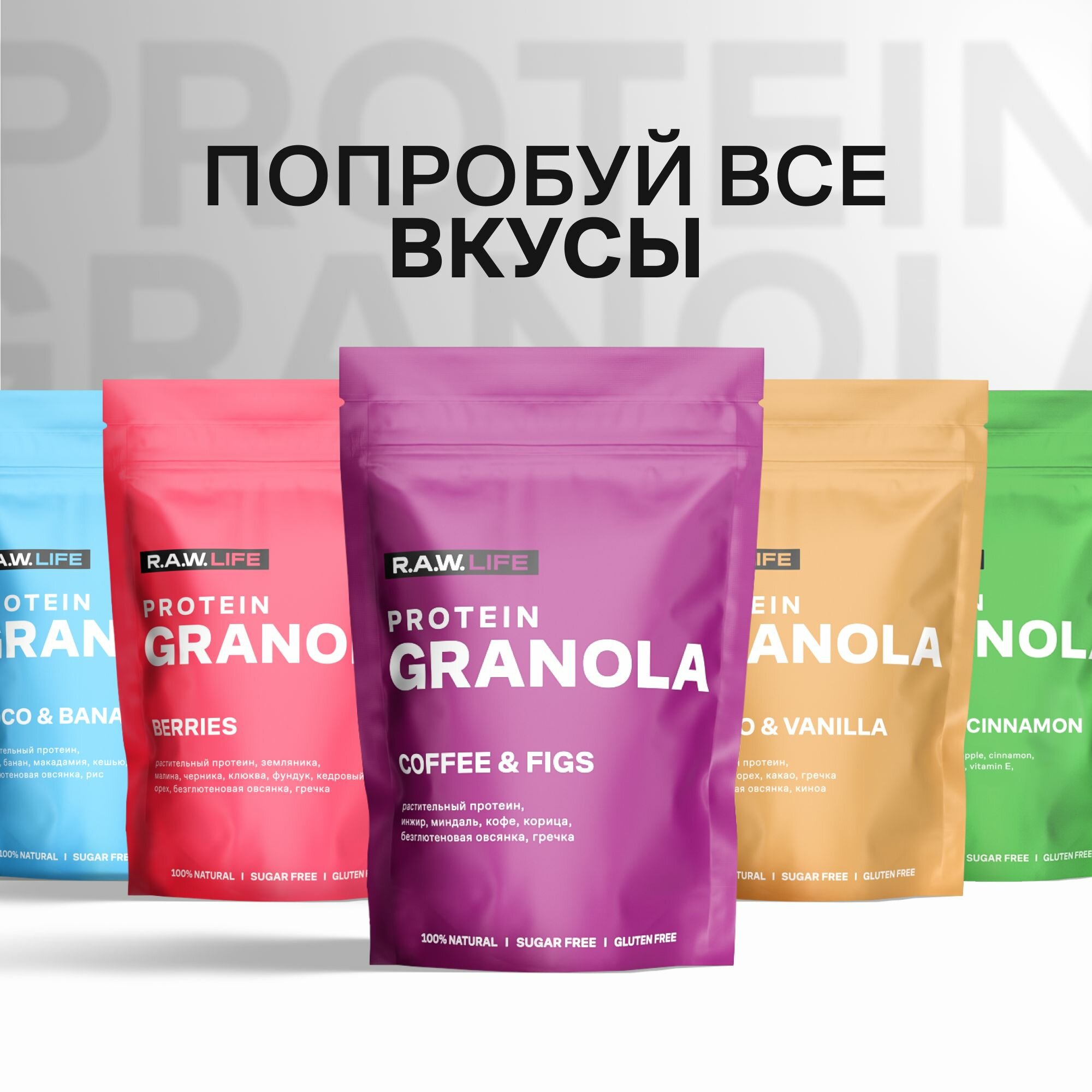 Гранола протеиновая R.A.W. LIFE без сахара, без глютена / Натуральный готовый веганский продукт для здорового питания / Кофе-инжир 220гр интересное: