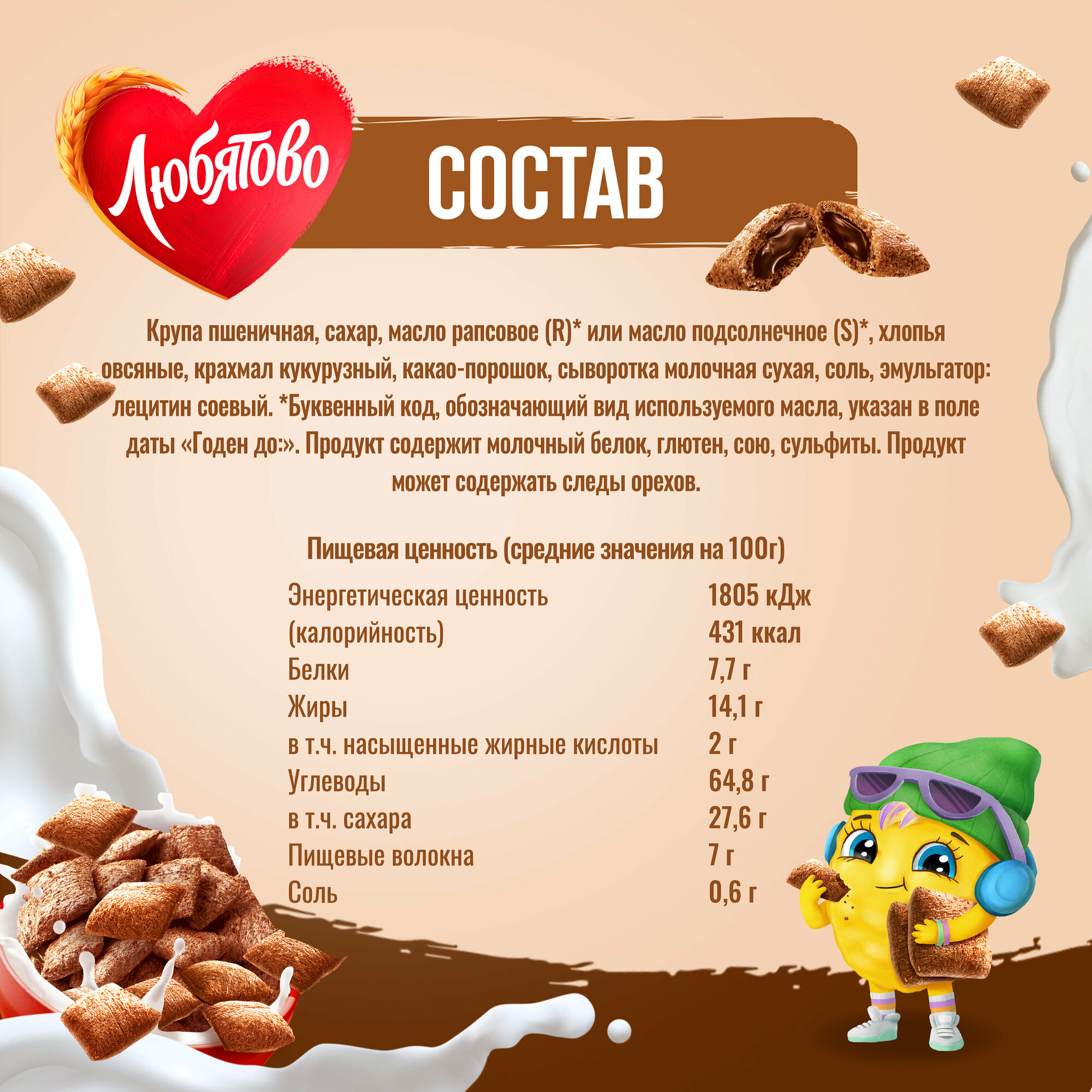| Состав | зерновые продукты (крупа пшеничная / хлопья овсяные / мука рисовая) / сахар / масло растительное / какао-порошок / крахмал кукурузный / соль / эмульгатор: лецитин соевый / молоко обезжиренное сухое |