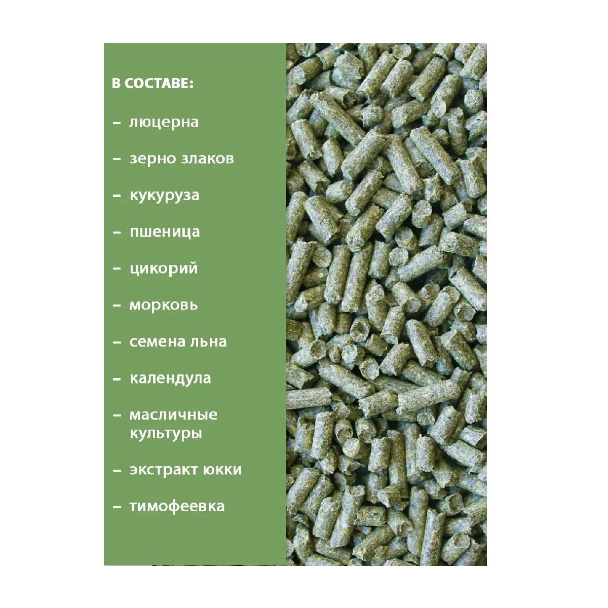 | Состав | травяные гранулы, овсянка, ячмень, пшеница, воздушные зерна, сорго, кукуруза, подсолнечник, конопляное семя, экструдированные гранулы, плоды рожкового дерева, морковь сушеная, капуста сушеная, шиповник, витаминно-минеральный комплекс |