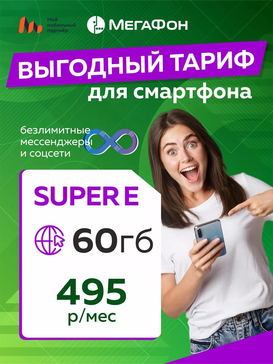 Сим-карта "Мегафон" Super Е, безлимитный интернет, 60Гб, Россия