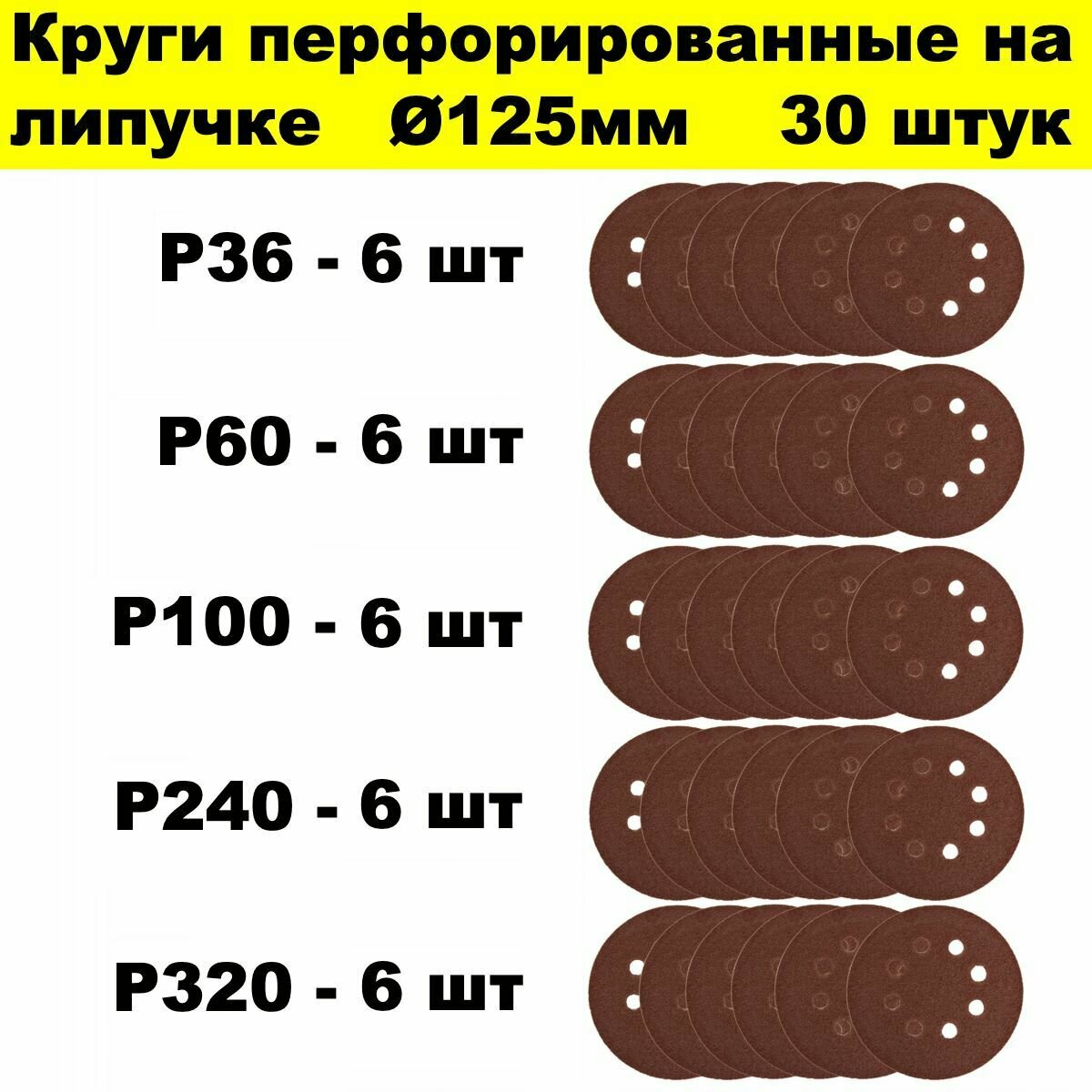 Круги перфорированные шлифовальные 125 мм Р36, Р60, Р100, Р240, Р400 30 штук набор из 5 зернистостей