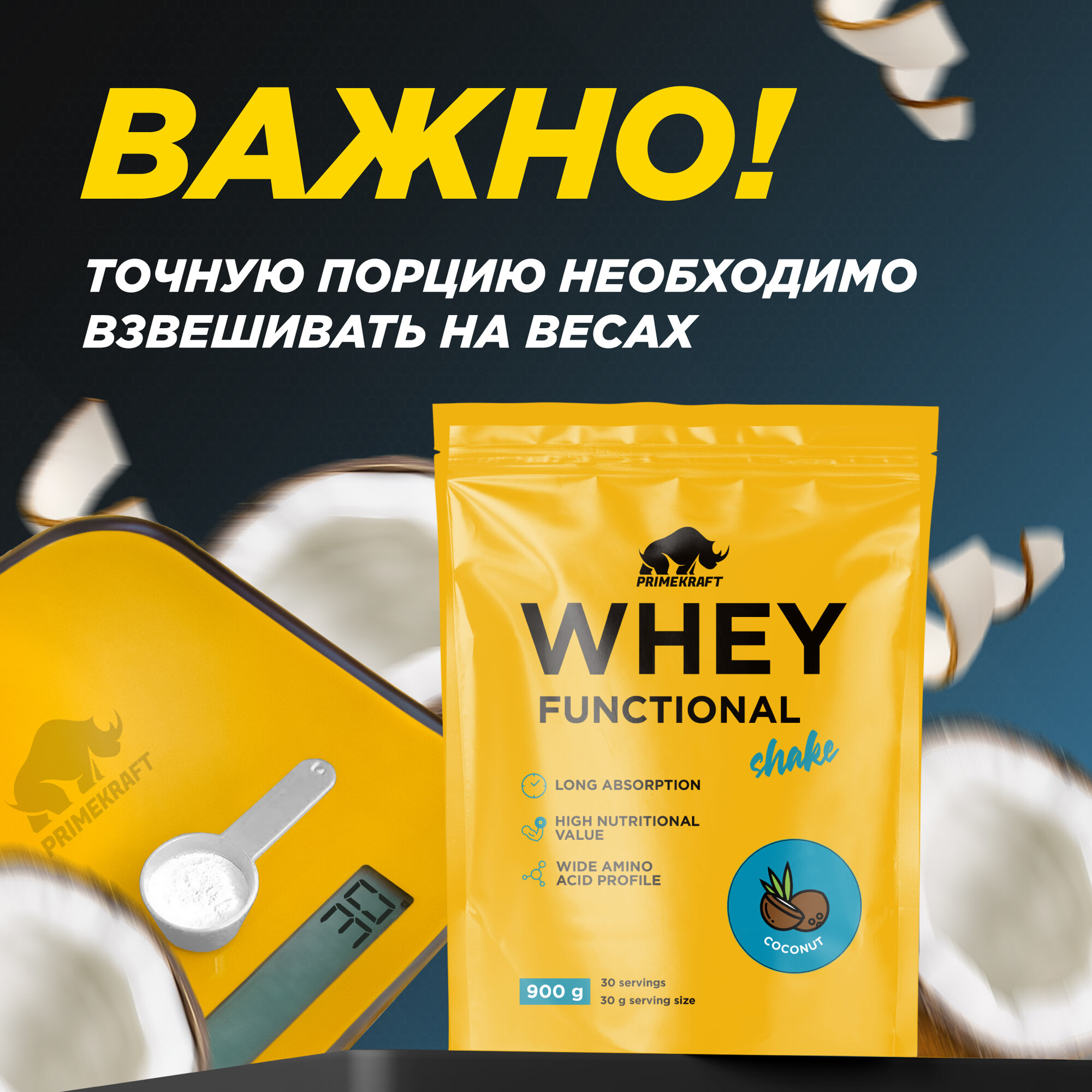 Купить Протеин сывороточный PRIMEKRAFT Whey Functional Shake, Кокос, 900 гр, дой пак