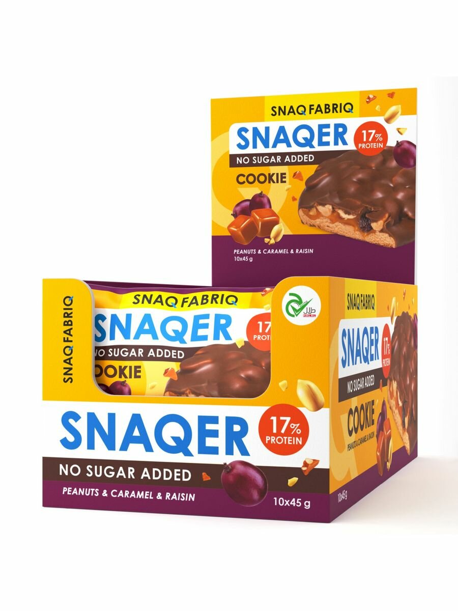 Купить SNAQ FABRIQ / SNAQER Протеиновое печенье в шоколаде "Арахис, изюм и карамель", 10 шт х 45 г