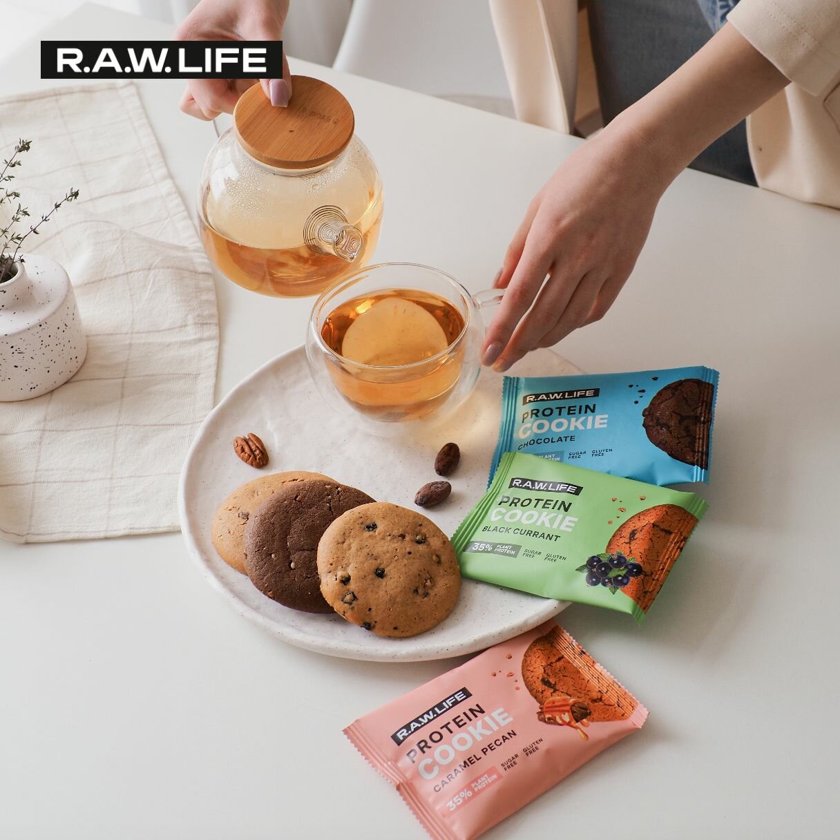 Купить Протеиновое печенье без сахара R.A.W.LIFE Ассорти / Шоколад, Карамель-Пекан, Черная смородина / Микс бокс 9 шт - 50гр