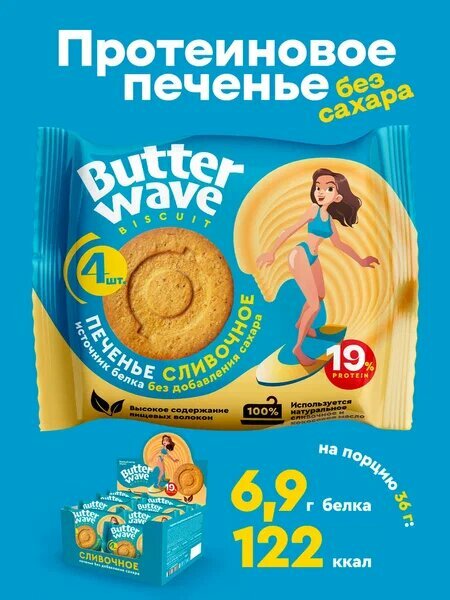 Протеиновое печенье без сахара "Butter Wave" Топленое молоко , коробка 32штуки (8 уп по 4шт)