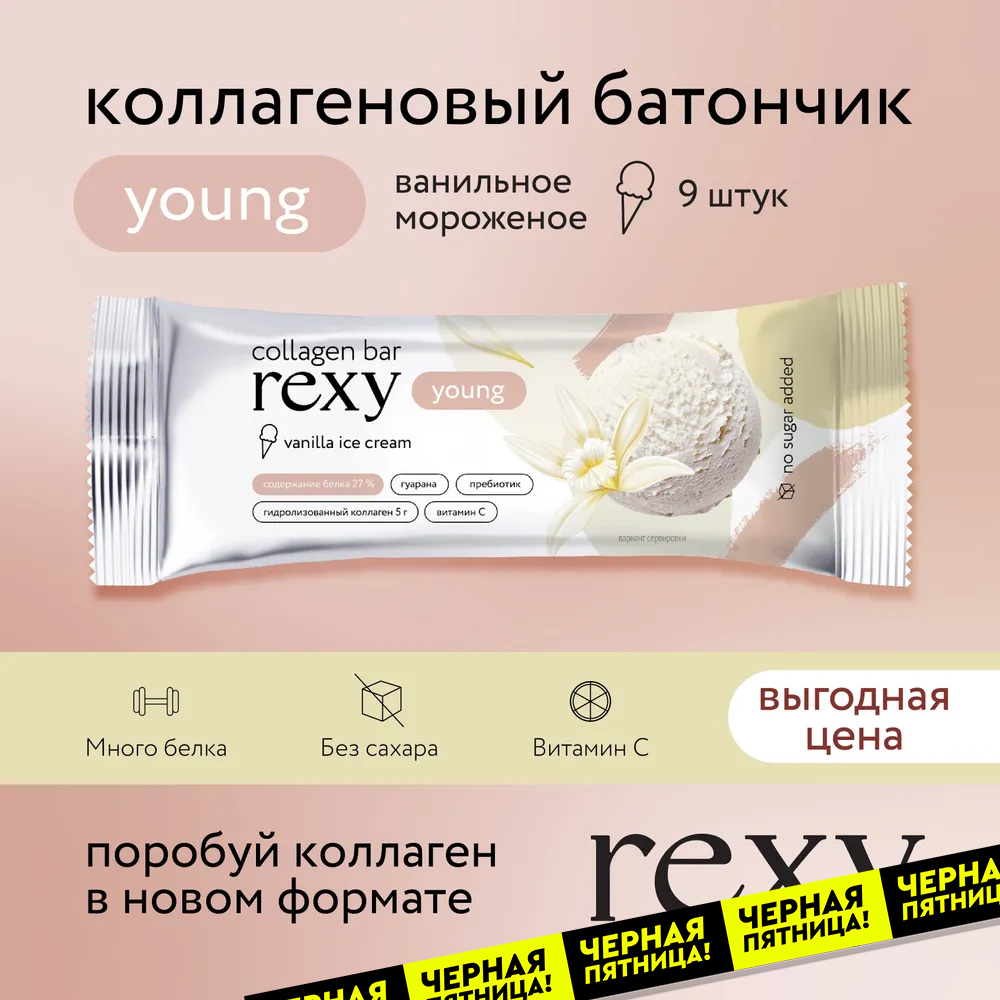Протеиновые батончики rexy young Ванильное мороженое, 9шт х 35г, без сахара 130ккал, ПП сладости, спортпит, с коллагеном
