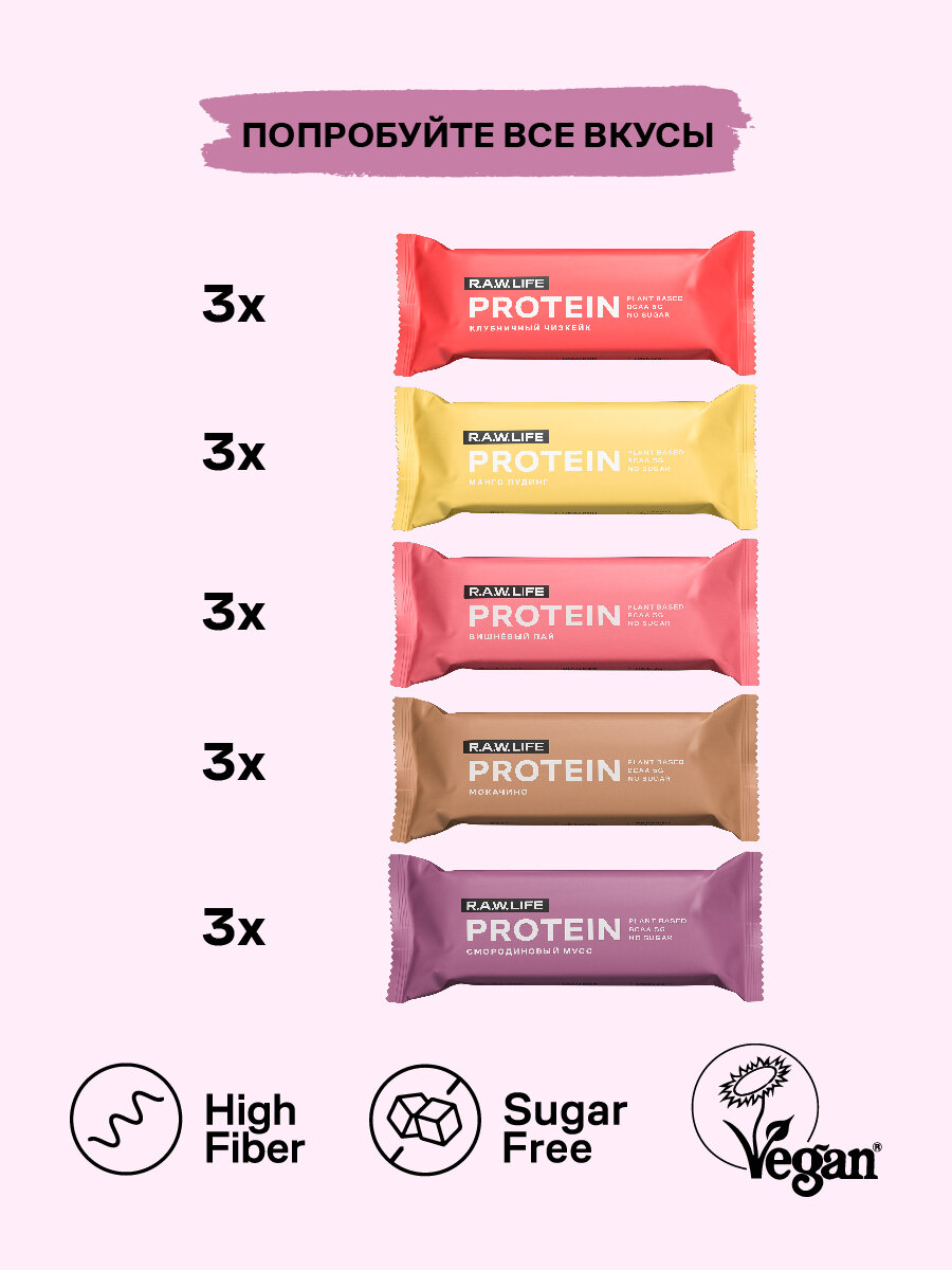 Батончики протеиновые R.A.W.LIFE Protein POWER MIX/ Набор пп продуктов питания без сахара, лактозы и глютена для похудения и спорта / Ассорти вкусов 15 шт по 43г интересное:
