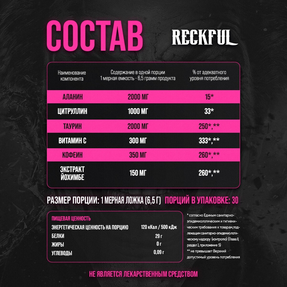 Предтренировочный комплекс Reckful со вкусом Фруктовый Пунш, 30 порций