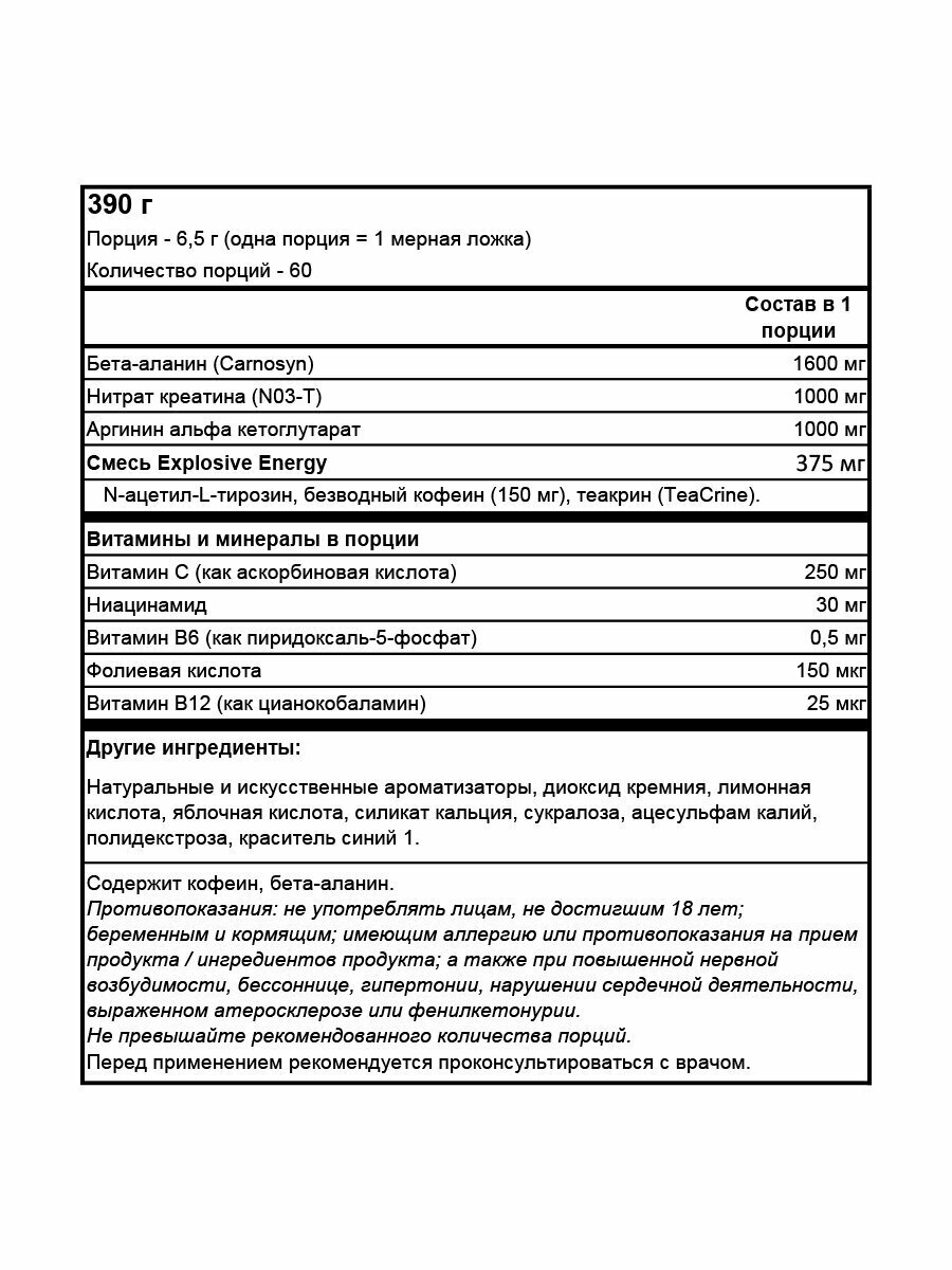 | Дополнительная информация | назначение: сила энергия; рекомендации по применению: для приготовления одной порции растворите 6,5 гр добавки (1 мерная ложка) в 180-200 мл воды. Принимайте по одной порции за полчаса до тренировки; состав: 1.6 г карнозина бета-аланина 1 г креатин нитрата (NO3-T®) 150 мг кофеина 1 г аргинина (AKG); содержание жиров в 100 г: 0 г; содержание белков в 100 г: 0 г; содержание углеводов в 100 г: 1 г |
