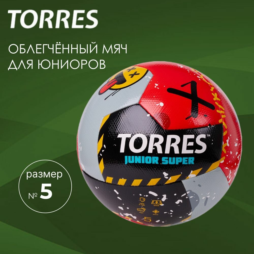 Мяч футб. TORRES Junior-5 Super, F323305, р.5, ПУ,4сл,12 п,гибрид.сш,крас-чёрн-сер