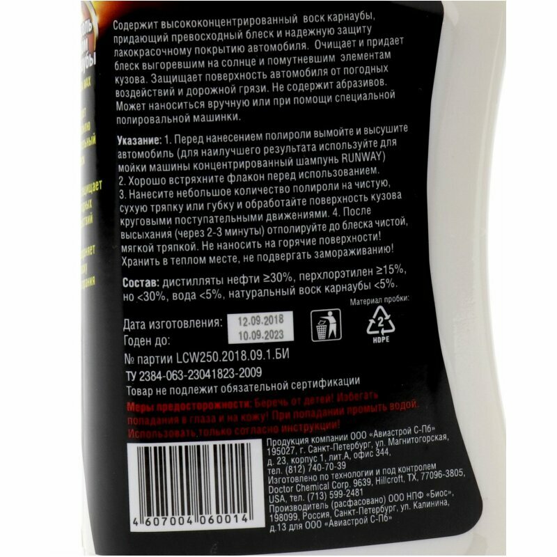 | Способ применения | перед нанесением полироли вымойте и высушите автомобиль (для наилучшего результата используйте для мойки машины концентрированный шампунь RUNWAY). Хорошо встряхните флакон перед использованием. Нанесите небольшое количество полироли на чистую, сухую тряпку или губку и обработайте поверхность кузова круговыми поступательными движениями. После высыхания (через 2-3 минуты) отполируйте до блеска чистой, мягкой тряпкой |