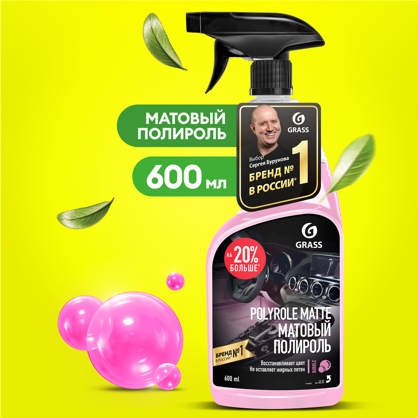 GRASS/ Полироль для пластика автомобиля Polyrole Matte Bubble // Очиститель пластика матовый, бабл гам, 600 мл.