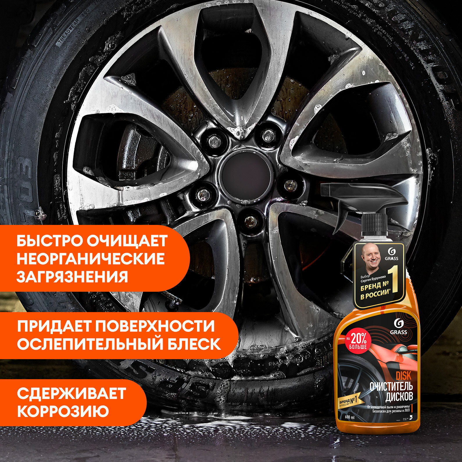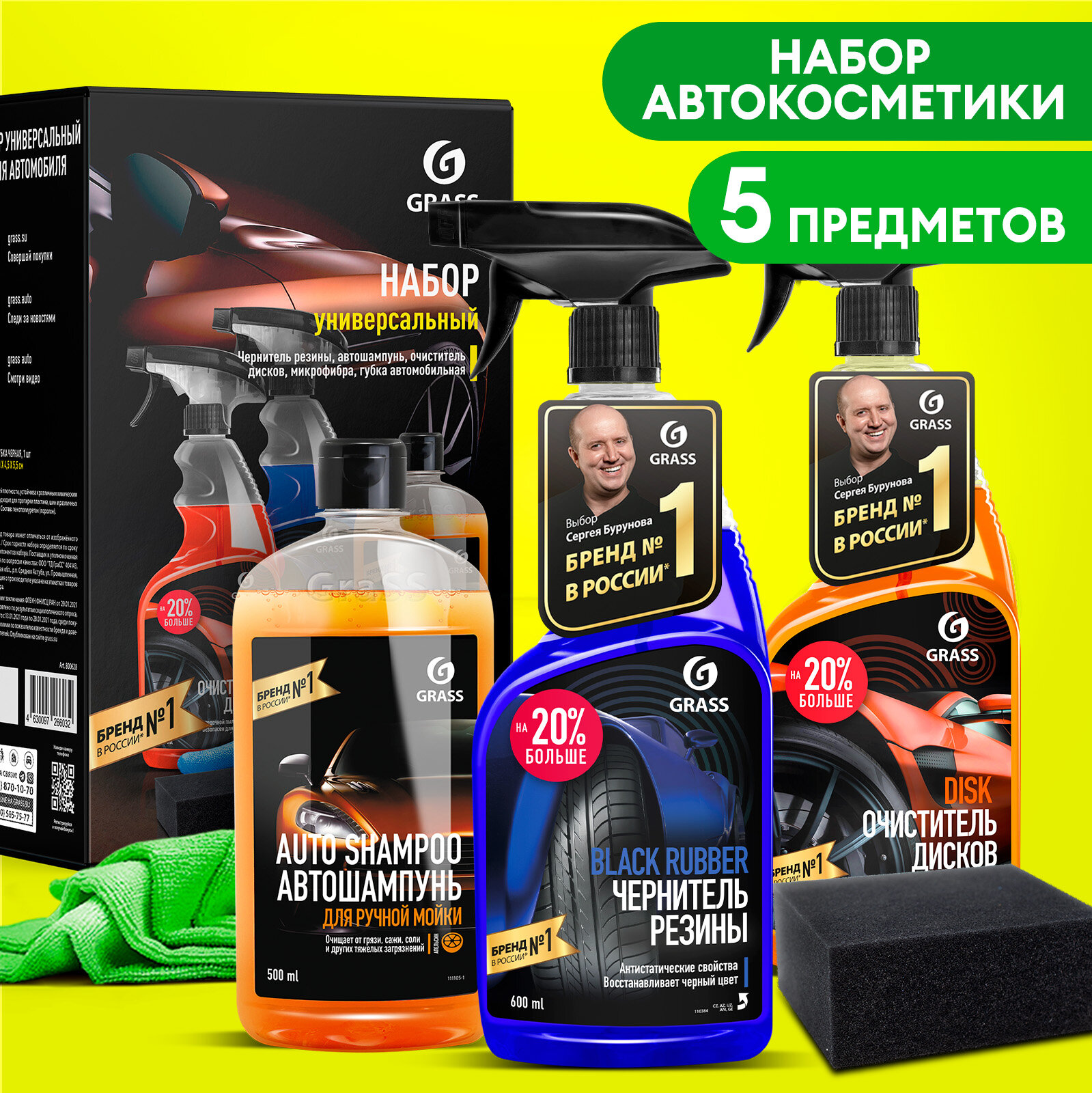 Подарочный набор автохимии для ухода за автомобилем Grass, 5 предметов очиститель дисков, чернитель резины, автошампунь, салфетка из микрофифры, губка