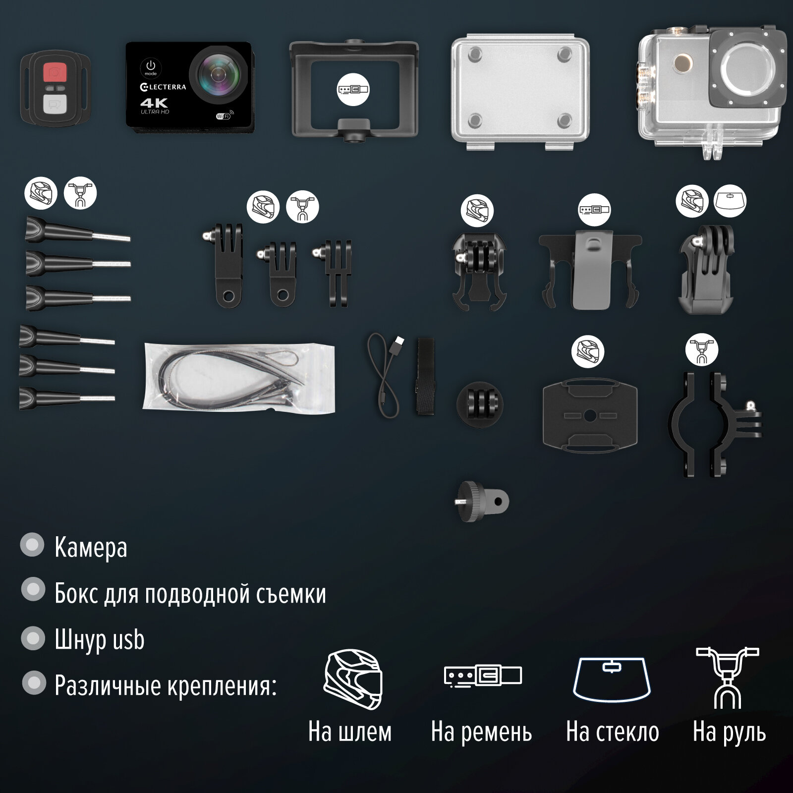 Купить Экшен камера Electerra 4К с водонепроницаемым кейсом, креплениями и пультом ДУ