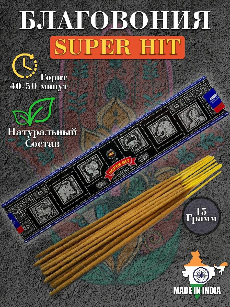 Благовония Satya Super Hit, Сатья Супер Хит, ароматические палочки, индийские, для дома, медитации, 15г