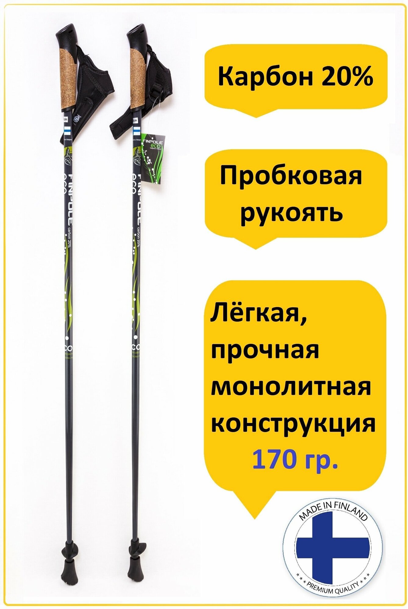 Скандинавские палки Finpole ECO, для ходьбы, 20% carbon, 120см, черные/зеленые