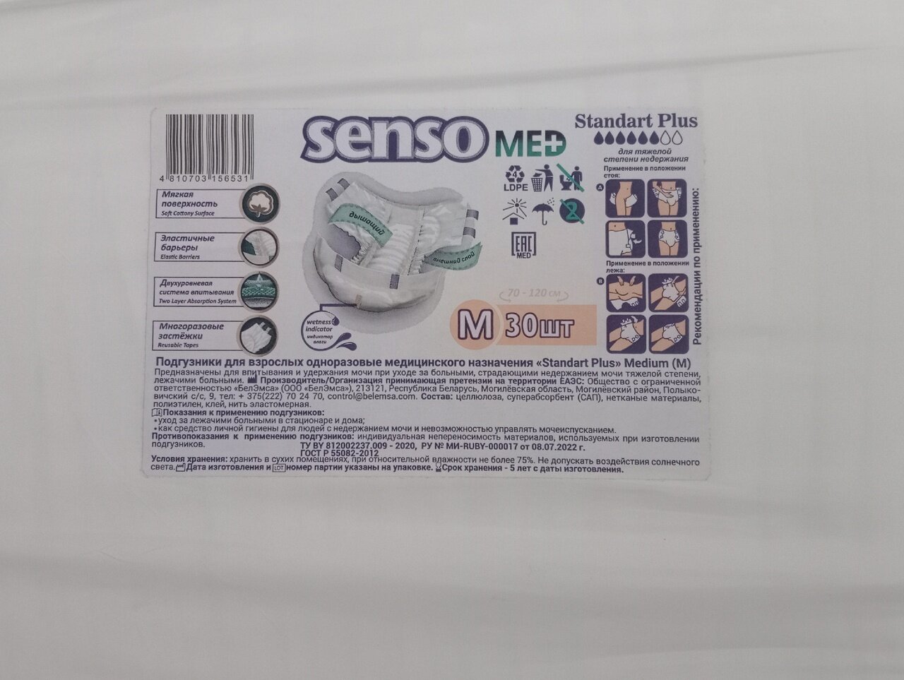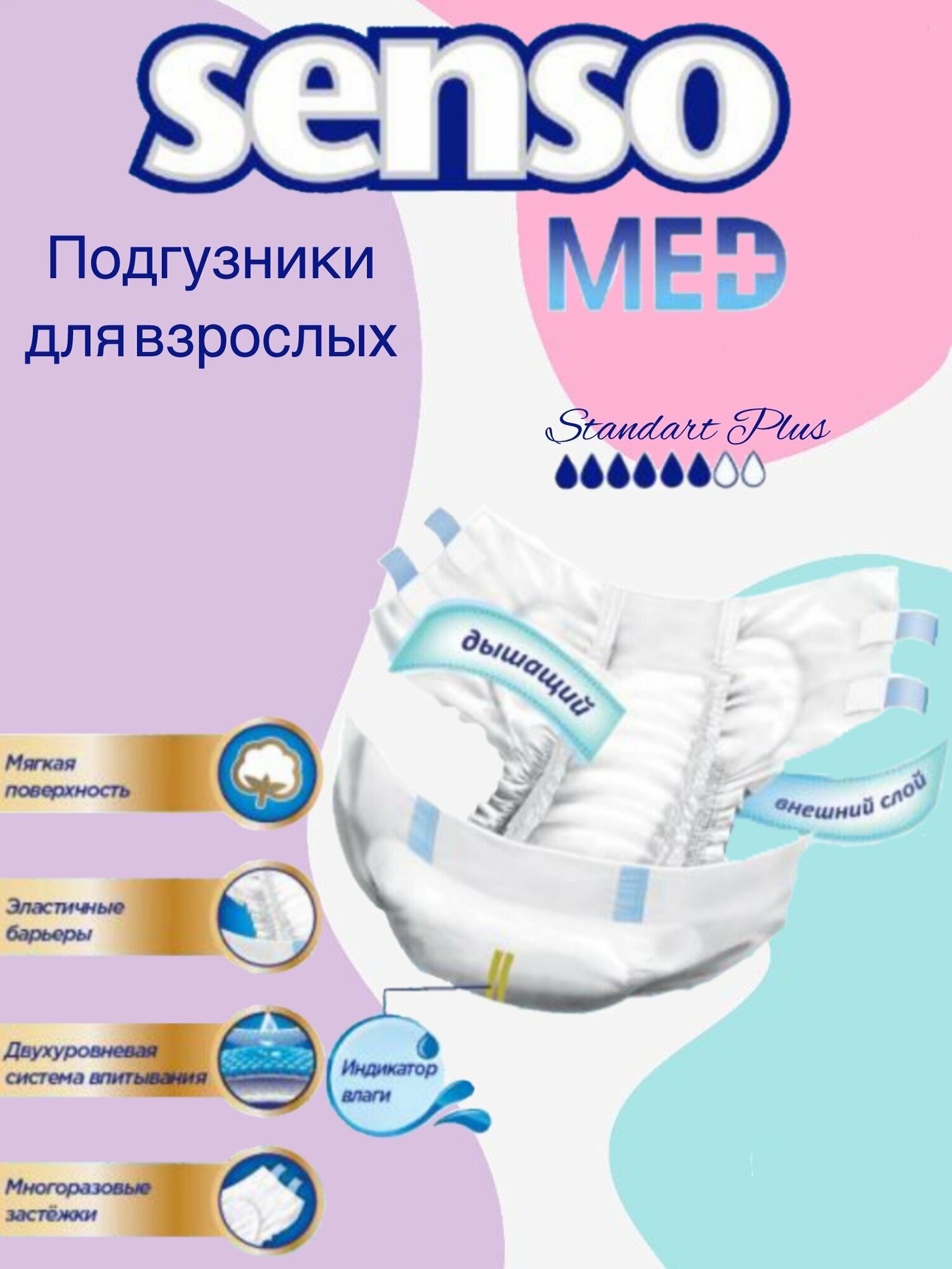 Подгузники для взрослых Senso Med Standard Plus M (70-120 см), 6 капель, 30 шт