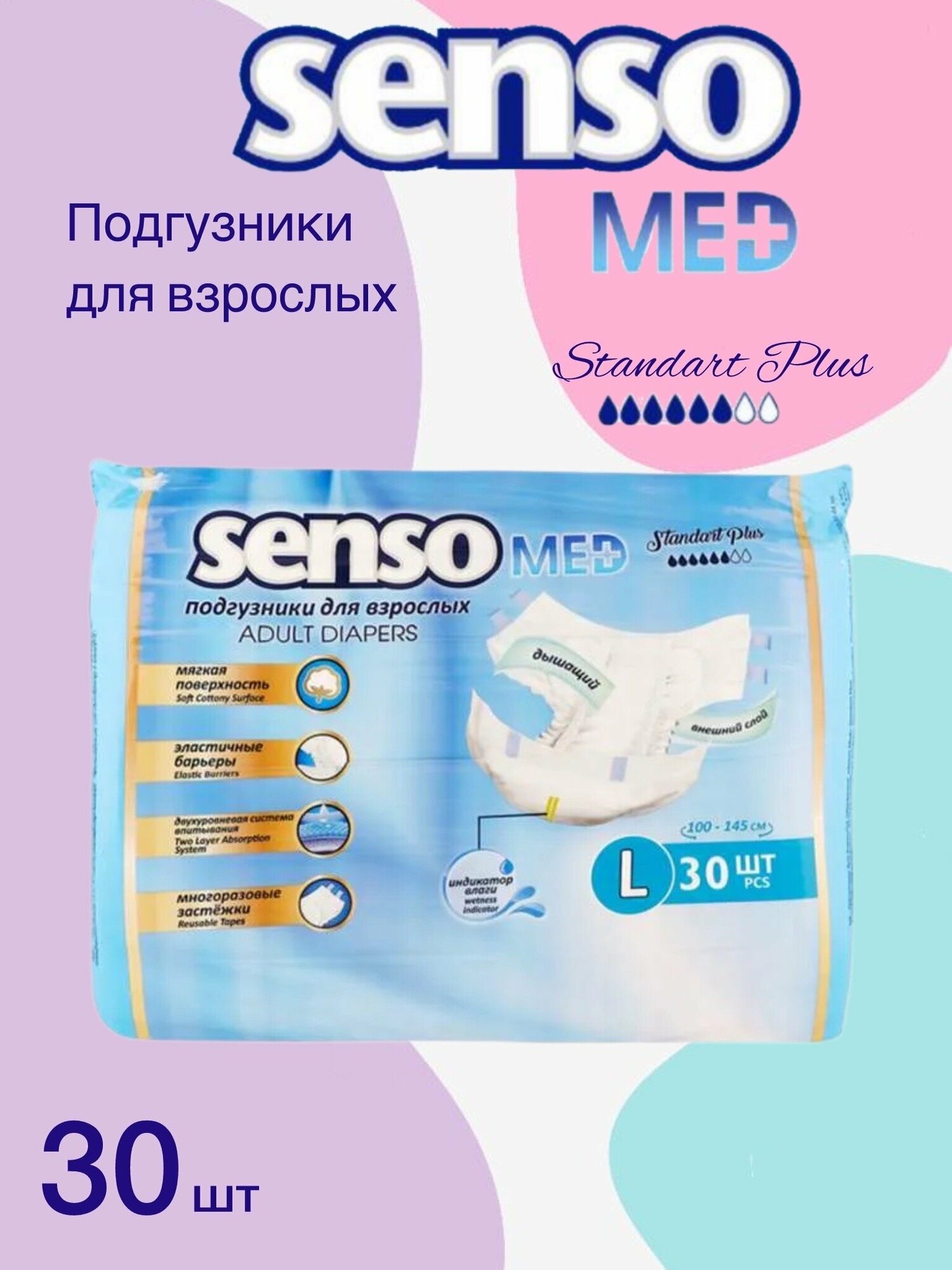 Подгузники для взрослых Senso Med, размер L, 30 штук, 6 капель (100-145 см обхват талии)