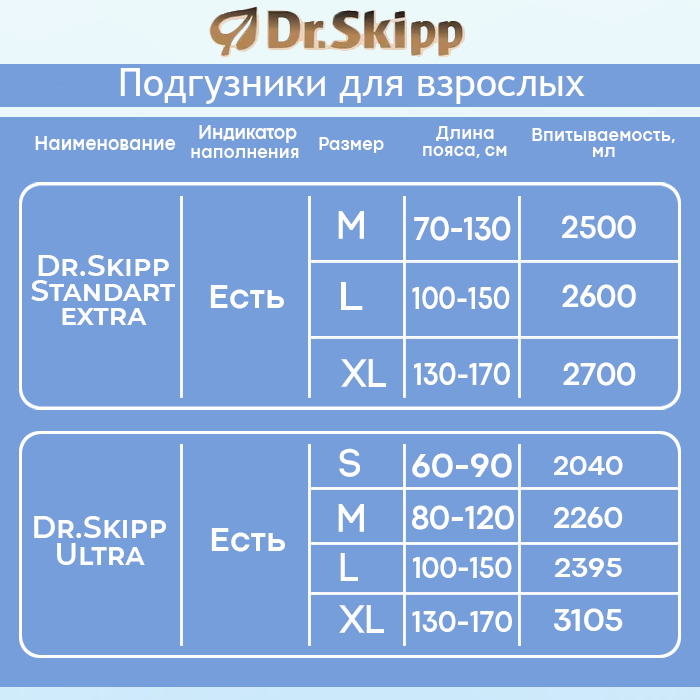 Подгузники для взрослых Dr.Skipp Ultra, размер XL (130 - 170 см), 30шт, 8109