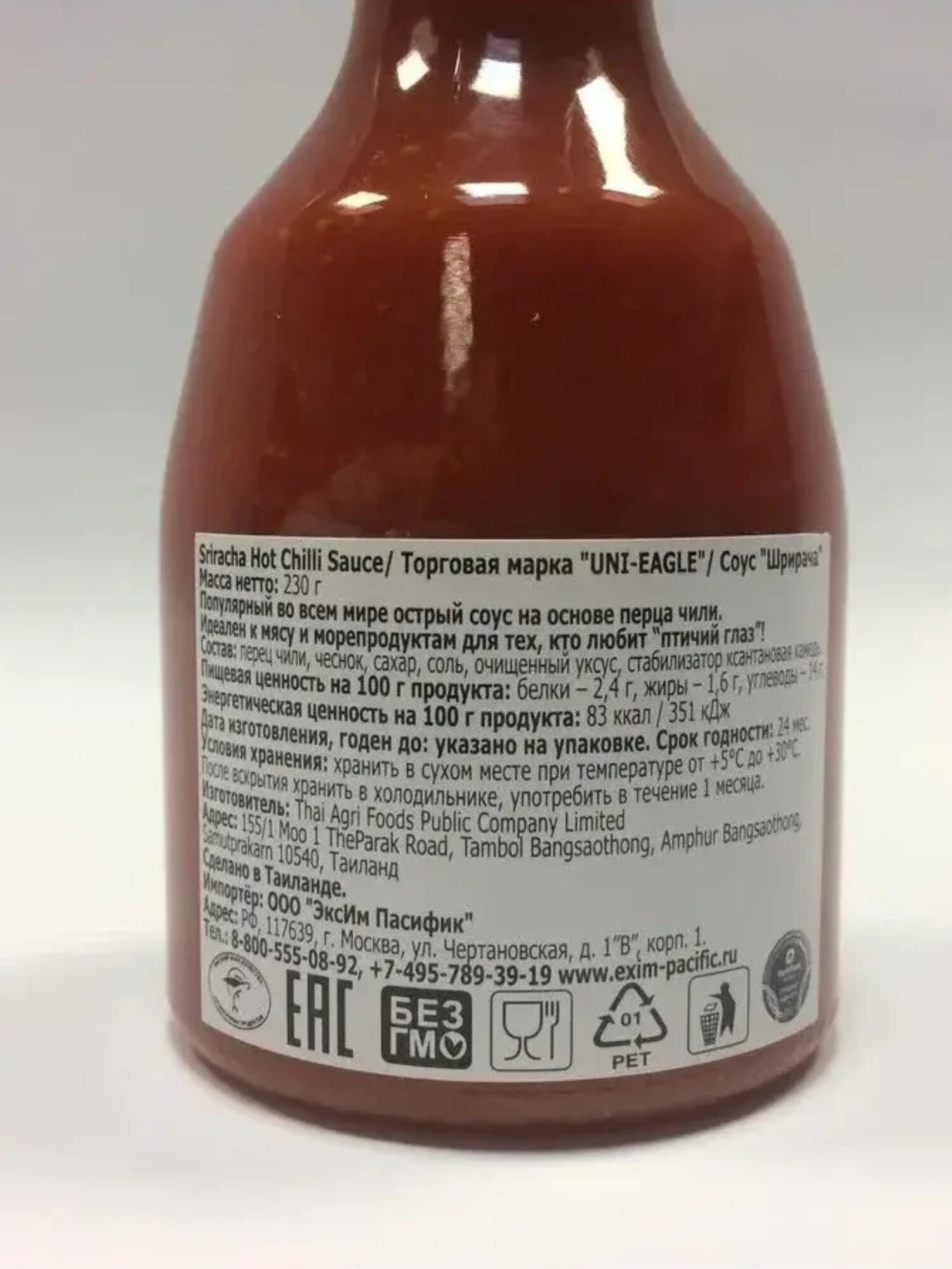 | Состав | перец чили 56%, чеснок, сахар, соль, очищенный уксус, консервант сорбат калия, стабилизатор ксантановая камедь |