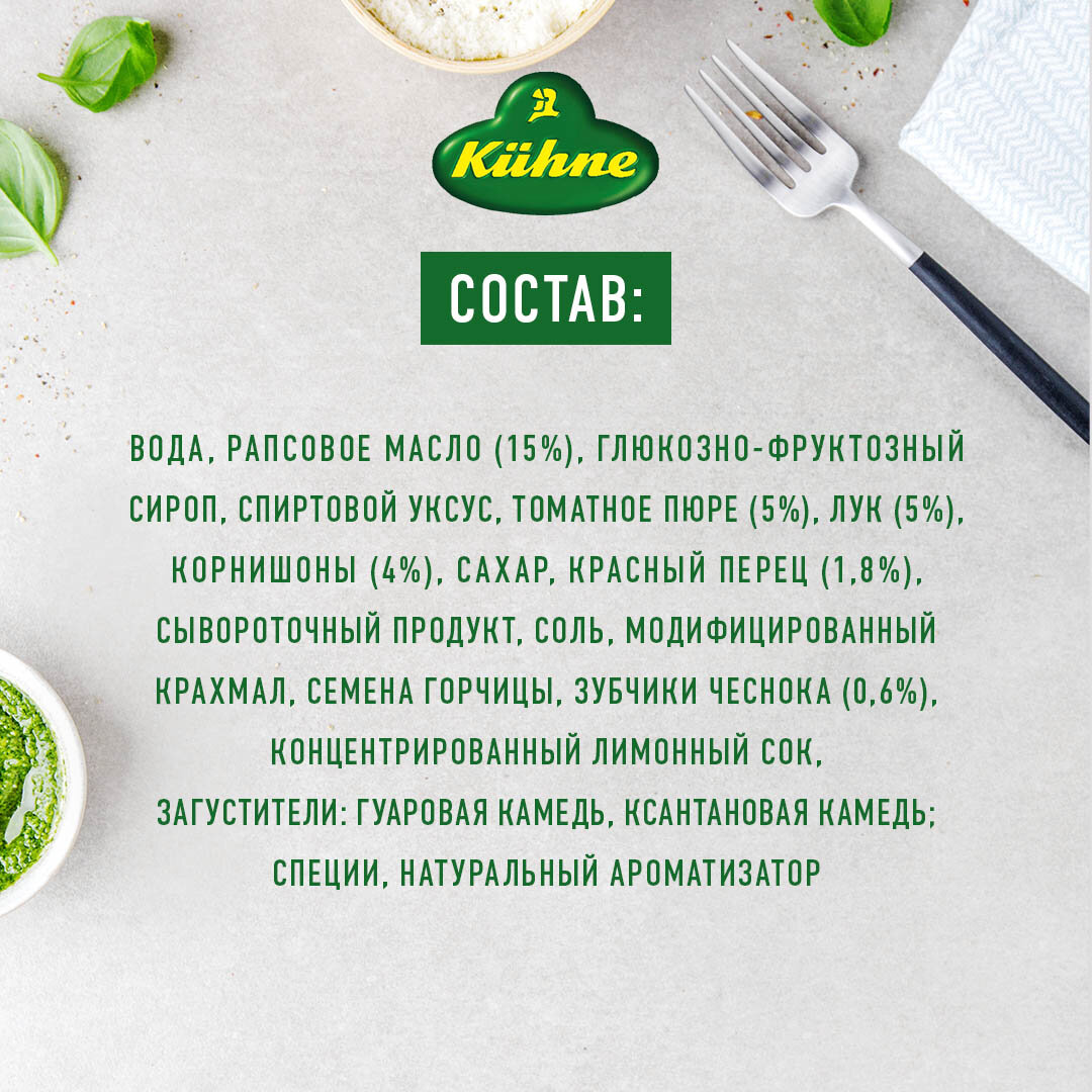 | Состав | Вода, рапсовое масло (15%), глюкозно-фруктозный сироп, спиртовой уксус, томатное пюре (5%), лук (5%), корнишоны (4%), сахар, красный перец (1.8%), молочная сыворотка, соль, модифицированный кукурузный крахмал, семена горчицы, зубчики чеснока (0.6%), концентрированный лимонный сок, загустители: гуаровая камедь, ксантановая камедь |