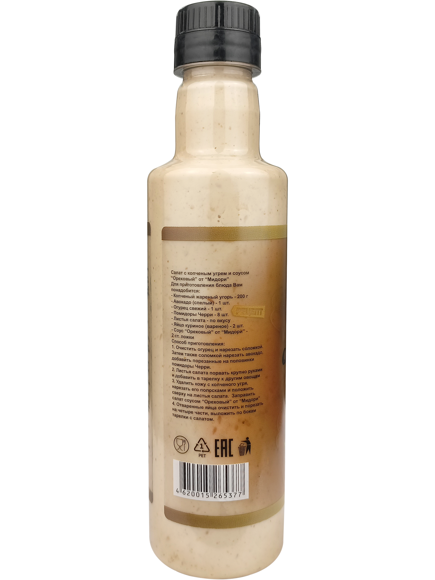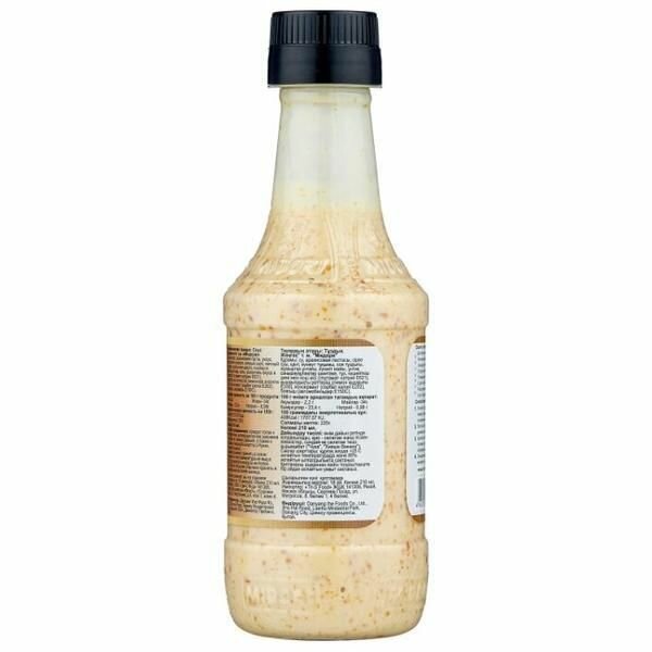 | Состав | вода, арахисовая паста, уксус, сахар, семя кунжута, соевый соус, яичный порошок, кунжутное масло, порошок грибов шиитаке, соль, усилитель вкуса и аромата (глутамат натрия Е621), регулятор кислотности (лимонная кислота Е330), консервант (сорбат калия Е202), краситель (карамель Е150С) |