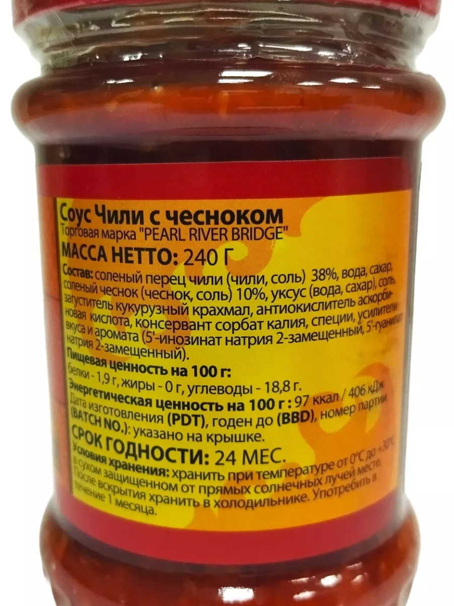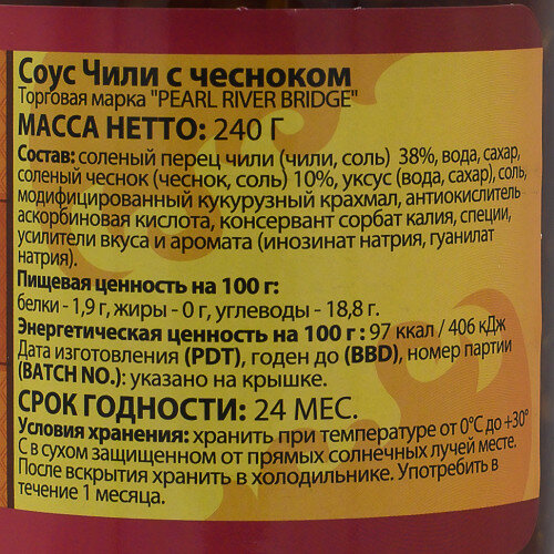 | Состав | солёный перец чили 28%, сахар 14.5 %, вода 13%, чеснок 10%, жёлтый перец чили 10%, рисовый уксус (вода 60 %, рис 40 %) 10%, соль 10 %, усилители вкуса и аромата инозинат натрия двузамещённый, гуанилат натрия двузамещённый, пищевая добавка модифицированный кукурузный крахмал, консервант сорбат калия, стабилизатор ксантановая камедь |