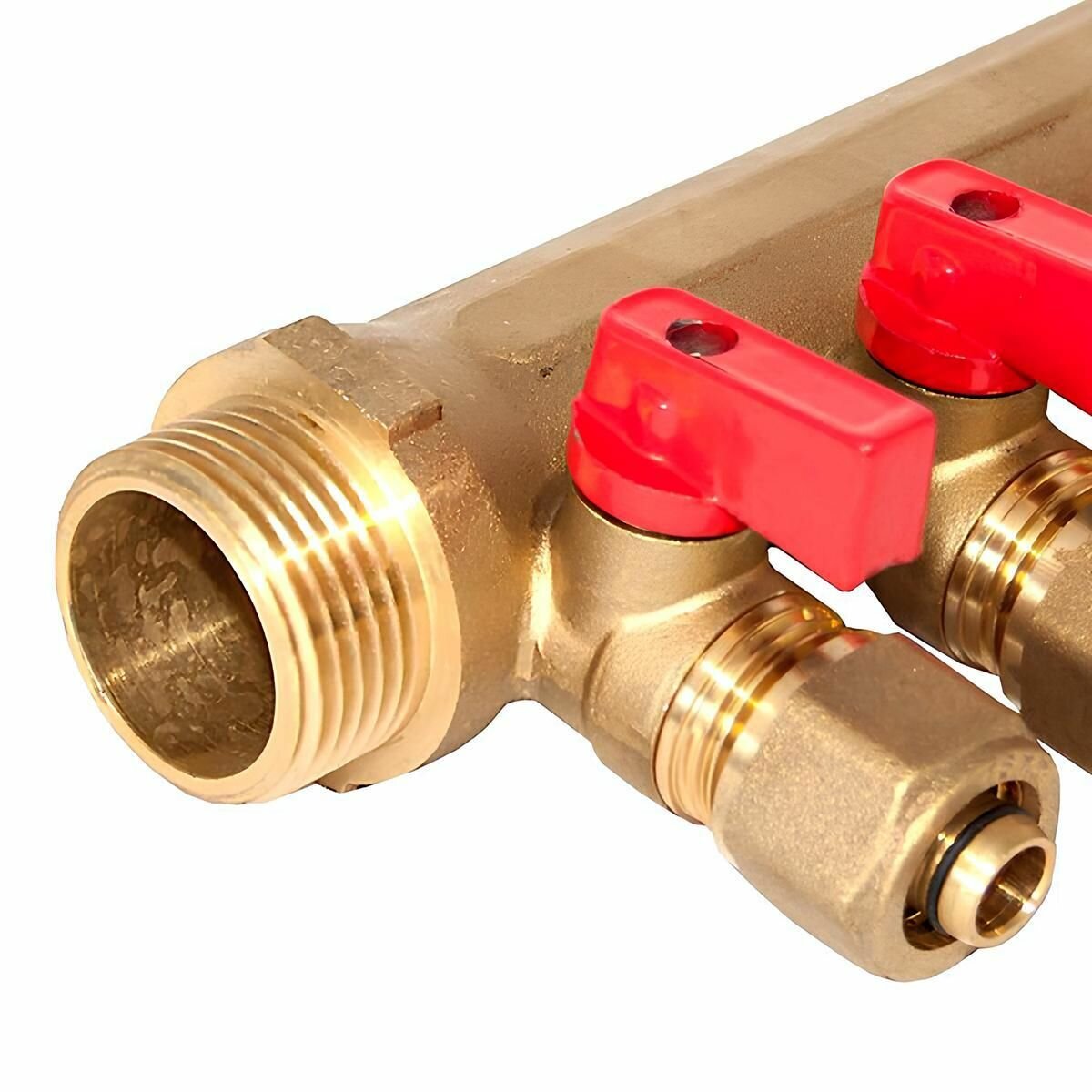 | Подробная комплектация | Коллектор с шаровыми кранами, упаковка.В комплекте имеются красные и синие ручки. |
