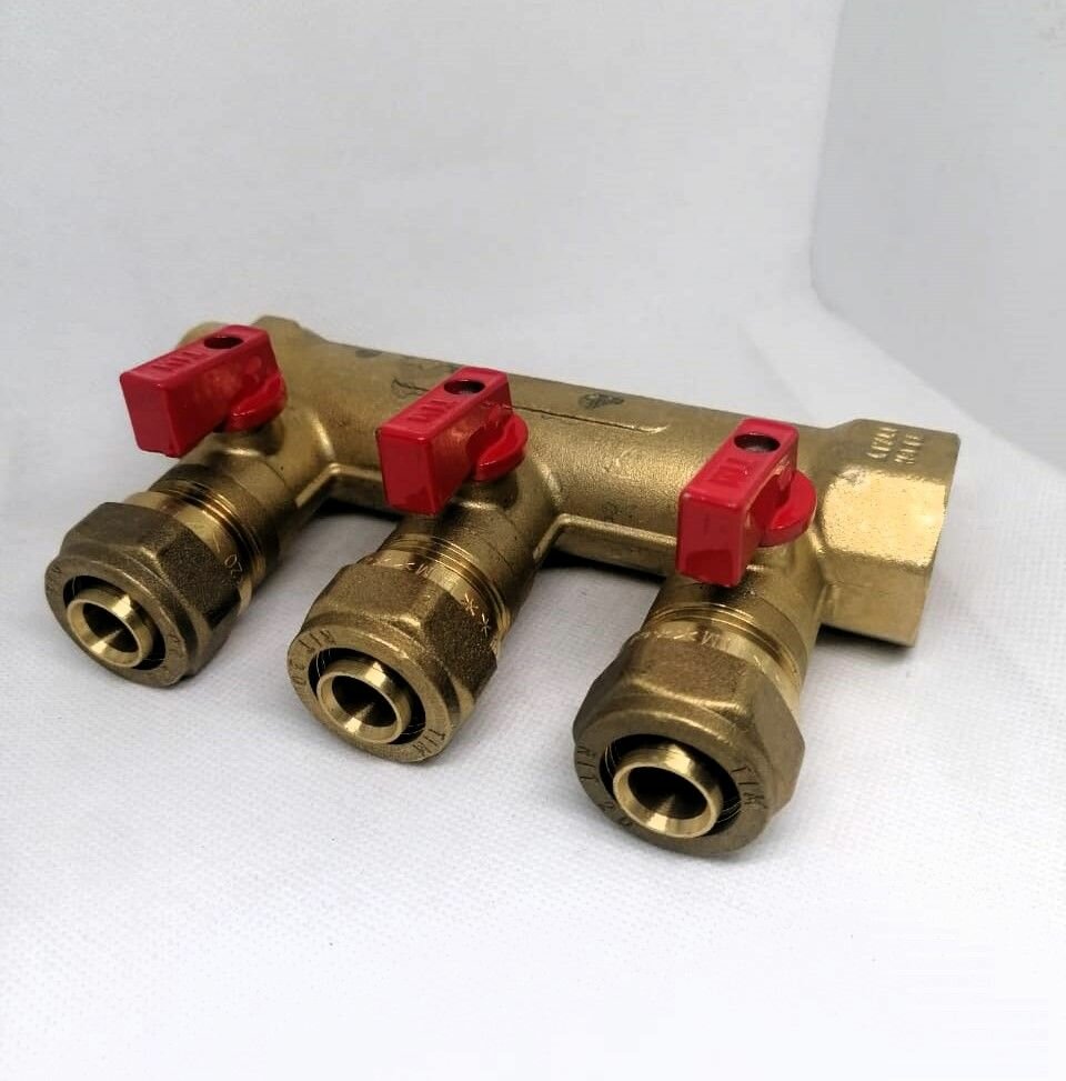 Купить Коллектор с шаровыми кранами и цангами 20х1" TIM, 3 выхода (красные и синие ручки в комплекте) арт. 200-1(3)-20