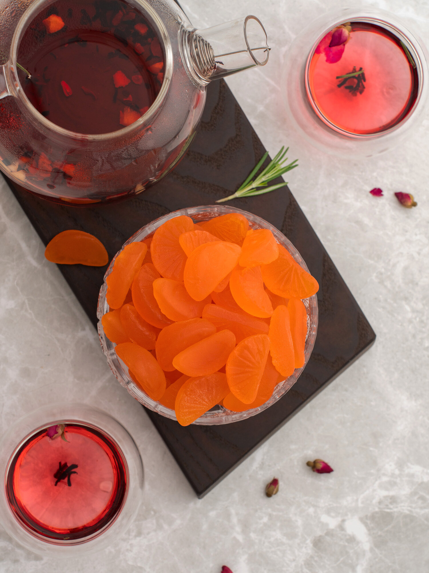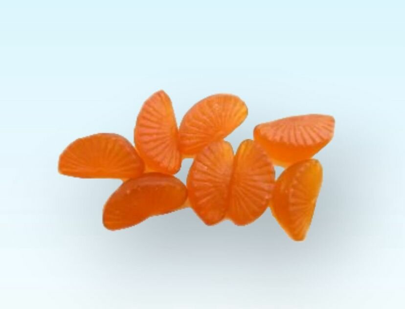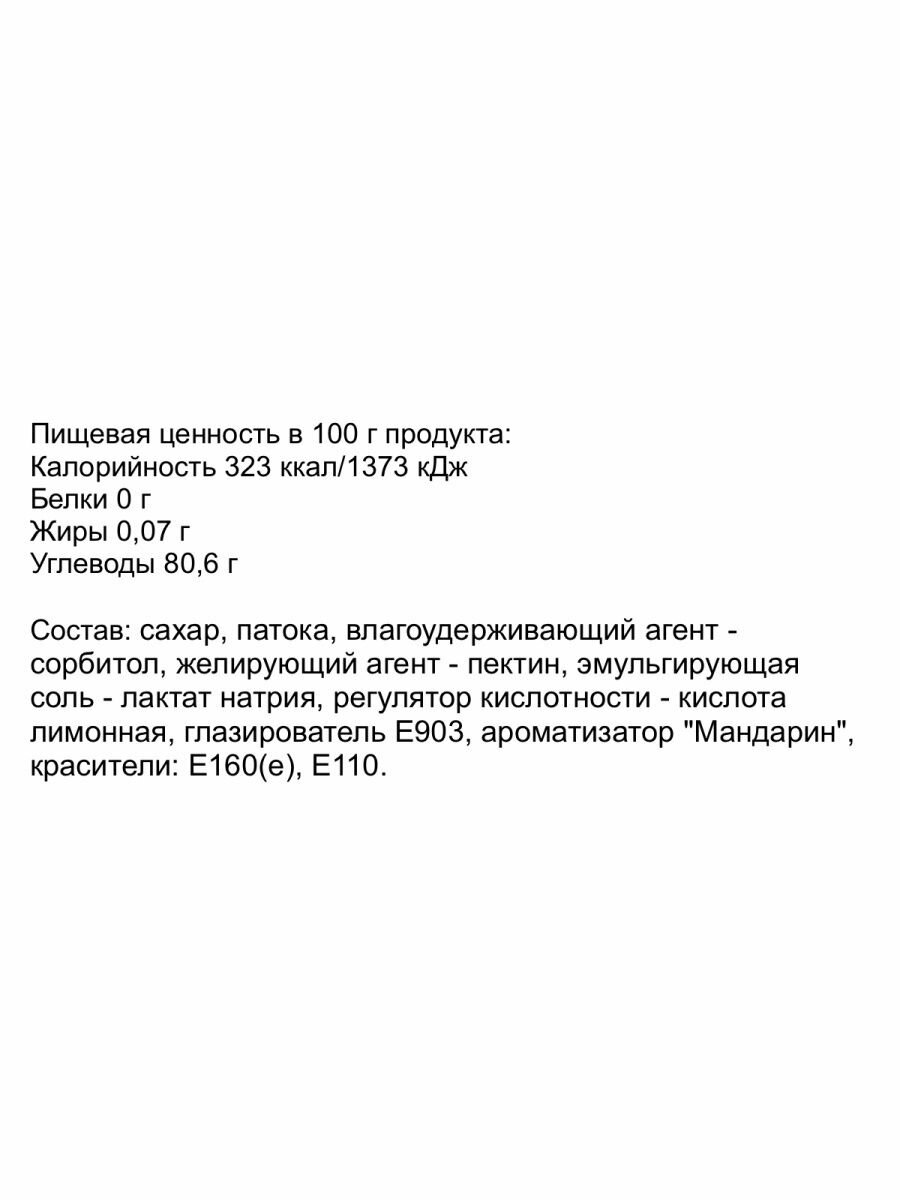 | Состав | сахар, патока, влагоудерживающий агент - сорбитол, желирующий агент - пектин, эмульгирующая соль - лактат натрия, регулятор кислотности - кислота лимонная, глазирователь Е903, ароматизатор "Мандарин", краситель натуральный Е160(е) |
