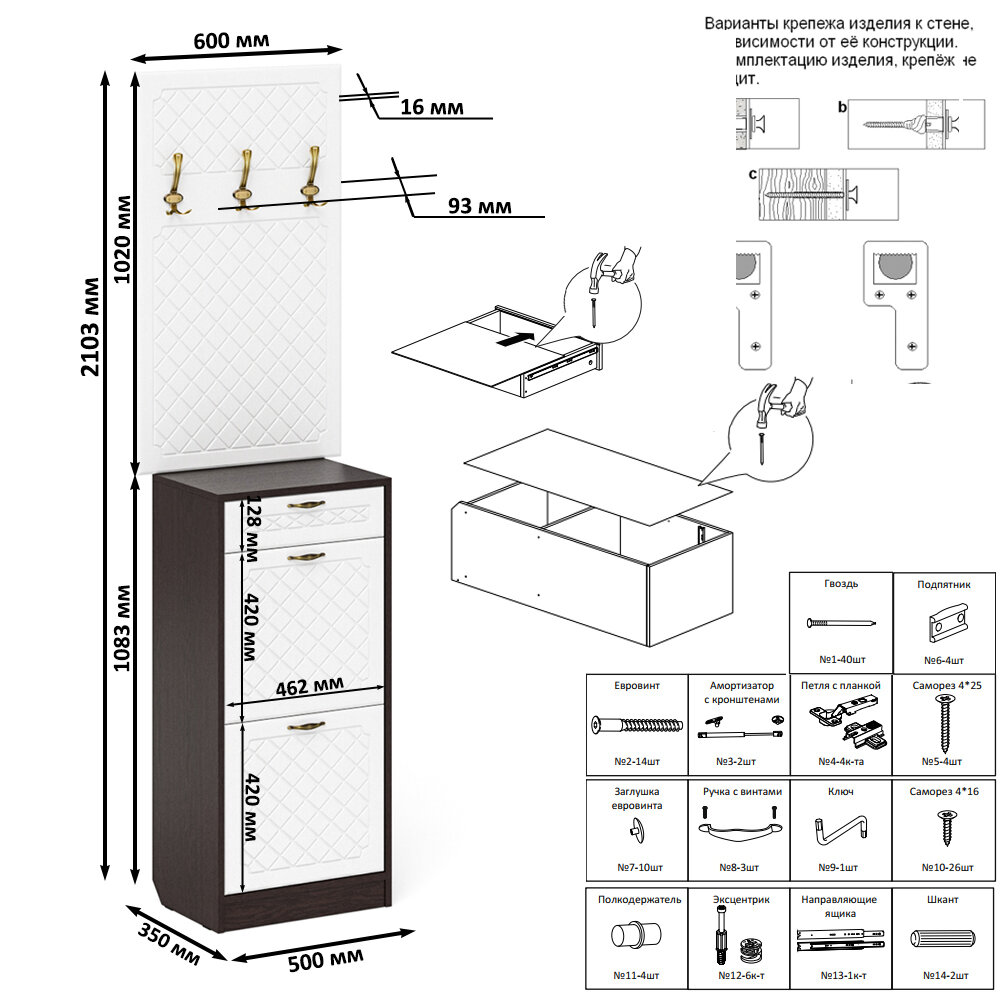 | Комплектация | конструктивно это две высокие тумбы, объединенных в единый блок, каждая тумба для обуви оборудована ящиком для мелочей сверцу и двумя отделениями с откидными фасадами для обуви, для фиксации откидных фасадов используется газлифт мебельный, выдвижные ящики установлены на металлические направляющие, обеспечивающие надёжное прямолинейное движение, двери закреплены на четырёхшарнирных петлях |