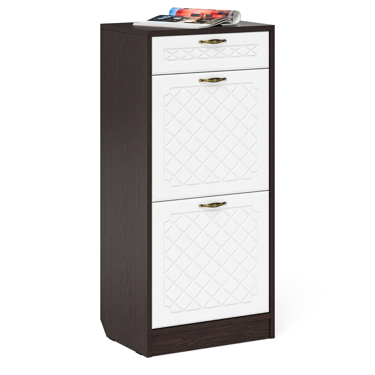 Две тумбы для обуви 2 секции с выдвижным ящиком, цвет венге/фасады МДФ белое дерево фрезеровка ромб, ШхГхВ 100х35х108,3 см