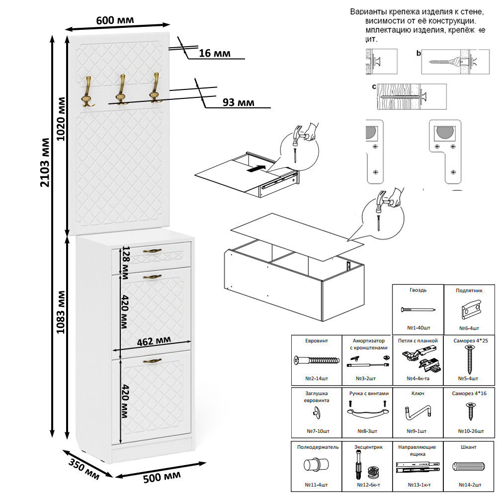 | Комплектация | конструктивно это две высокие тумбы, объединенных в единый блок, каждая тумба для обуви оборудована ящиком для мелочей сверцу и двумя отделениями с откидными фасадами для обуви, для фиксации откидных фасадов используется газлифт мебельный, выдвижные ящики установлены на металлические направляющие, обеспечивающие надёжное прямолинейное движение, двери закреплены на четырёхшарнирных петлях |