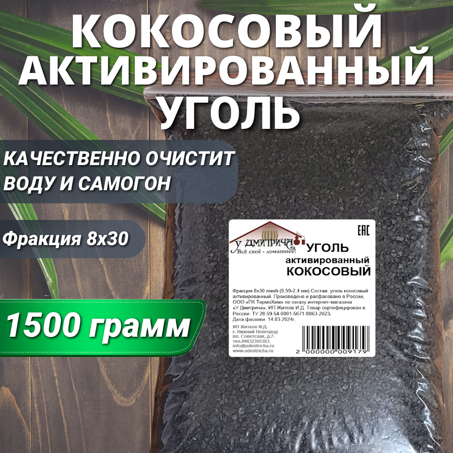 Купить Уголь активированный кокосовый "У Дмитрича" для очистки воды, самогона, воздуха 1500гр.