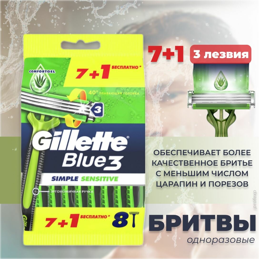 Купить Gillette Одноразовые Мужские Бритвы Blue3 Simple Sensitive, с 3 лезвиями, 8, плавающая головка