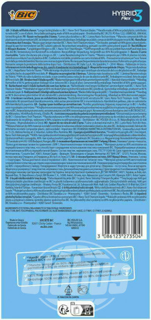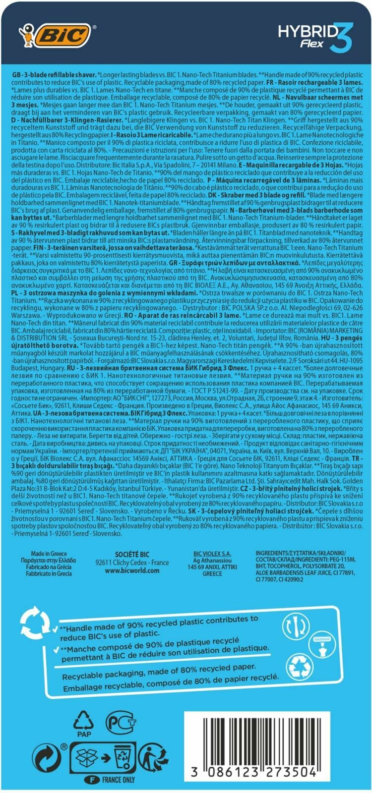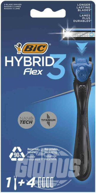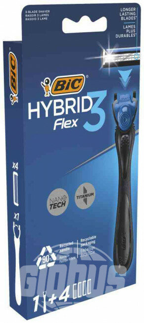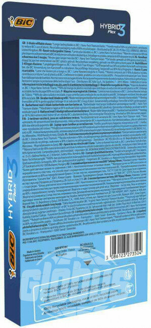 | Дополнительная информация | BIC Hybrid 3 Flex - это мужская бритвенная система, где три подвижных нанотехнологичных лезвия, индивидуально подстраиваются под контуры лица для тщательного и гладкого бритья. Каждая кассета оснащена специальной увлажняющей полоской на плавающей головке. Бритва изготовлена в Европе на заводах BIC и проходит более 25 тестов контроля качества. |