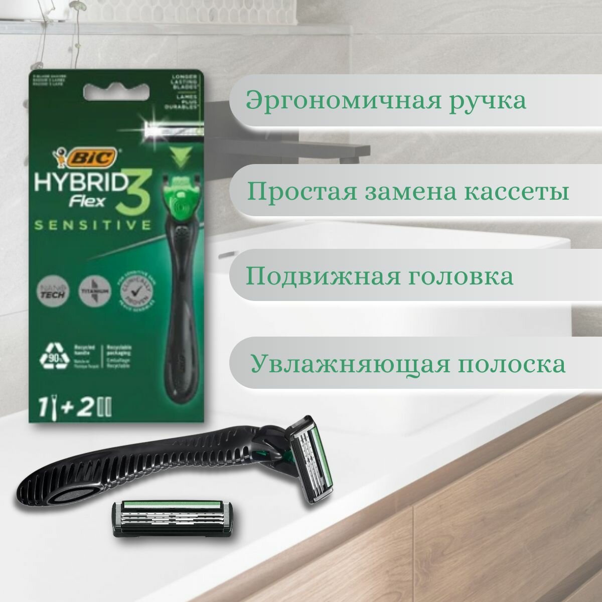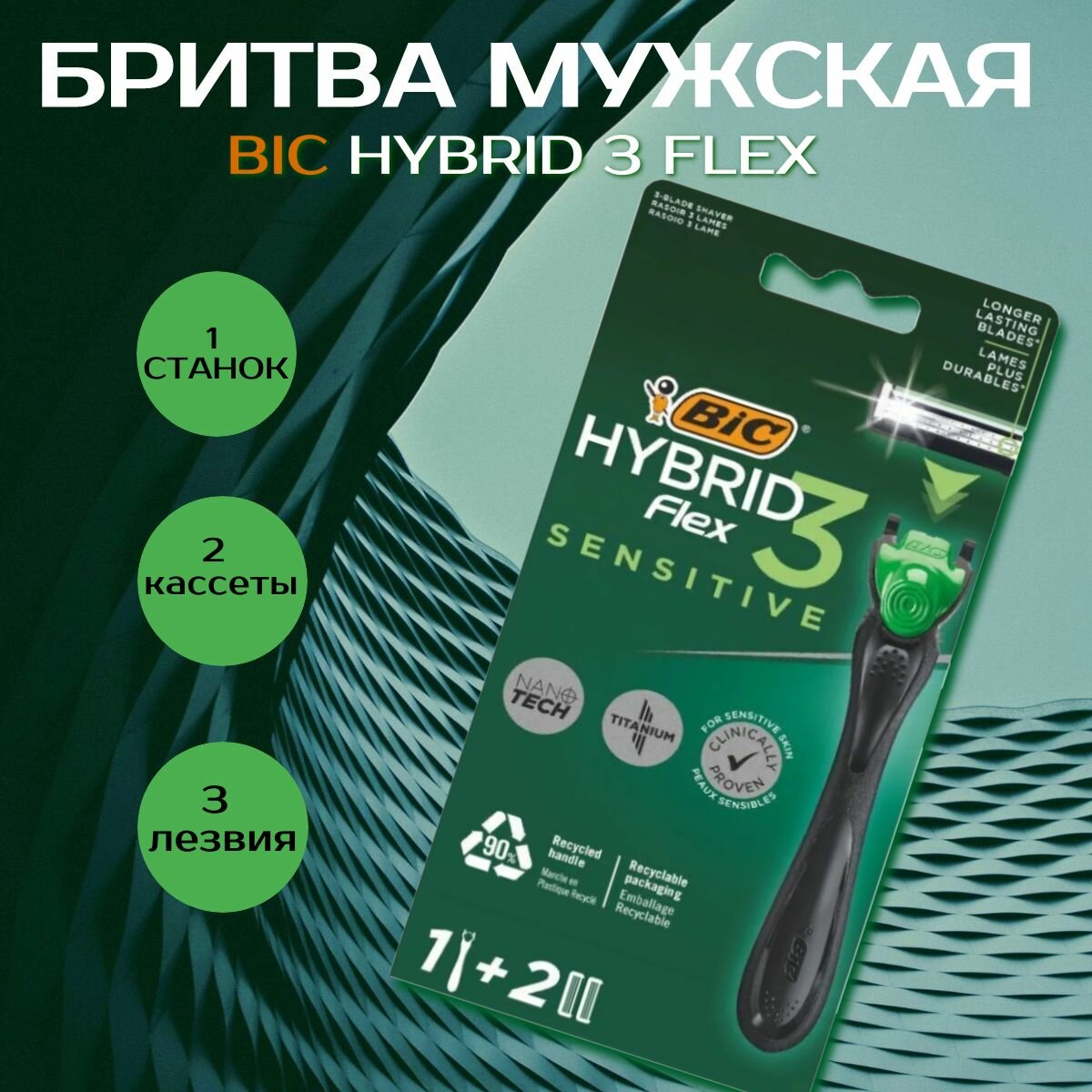 Многоразовый бритвенный станок Bic Hybrid 3 Flex Sensitive, с двумя сменными кассетами черный/зеленый. интересное: