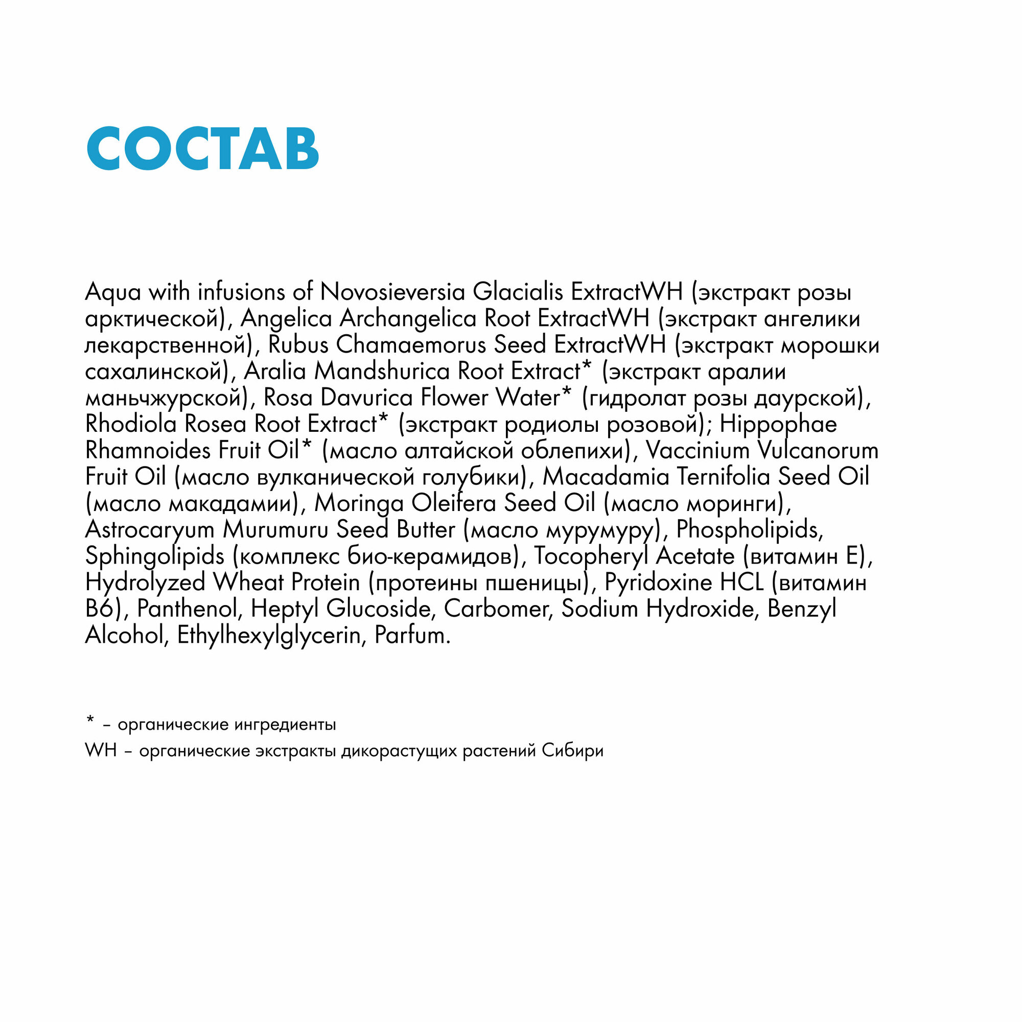 | Состав | Aqua with infusions of Novosieversia Glacialis ExtractWH (экстракт розы арктической), Angelica Archangelica Root ExtractWH (экстракт ангелики лекарственной), Rubus Chamaemorus Seed ExtractWH (экстракт морошки сахалинской), Aralia Mandshurica Root Extract* (экстракт аралии маньчжурской), Rosa Davurica Flower Water* (гидролат розы даурской), Rhodiola Rosea Root Extract* (экстракт родиолы розовой); Hippophae Rhamnoides Fruit Oil* (масло алтайской облепихи), Vaccinium Vulcanorum Fruit Oil (масло вулканической голубики), Macadamia Ternifolia Seed Oil (масло макадамии), Moringa Oleifera Seed Oil (масло моринги), Astrocaryum Murumuru Seed Butter (масло мурумуру), Phospholipids, Sphingolipids (комплекс био-керамидов), Tocopheryl Acetate (витамин Е), Hydrolyzed Wheat Protein (протеины пшеницы), Pyridoxine HCL (витамин В6), Panthenol, Heptyl Glucoside, Carbomer, Sodium Hydroxide, Benzyl Alcohol, Ethylhexylglycerin, Parfum. (*) – органические ингредиенты (WH) – органические экстракты дикорастущих растений Сибири |