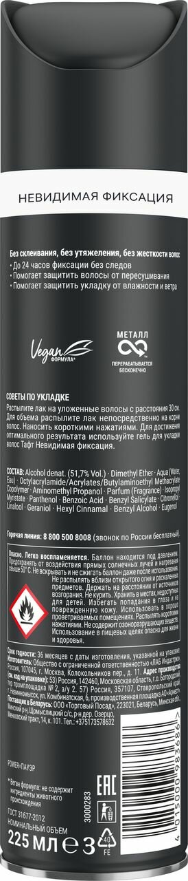 Тафт 225 мл Лак для волос Power Невидимая фиксация, мегафиксация