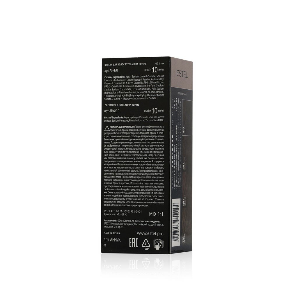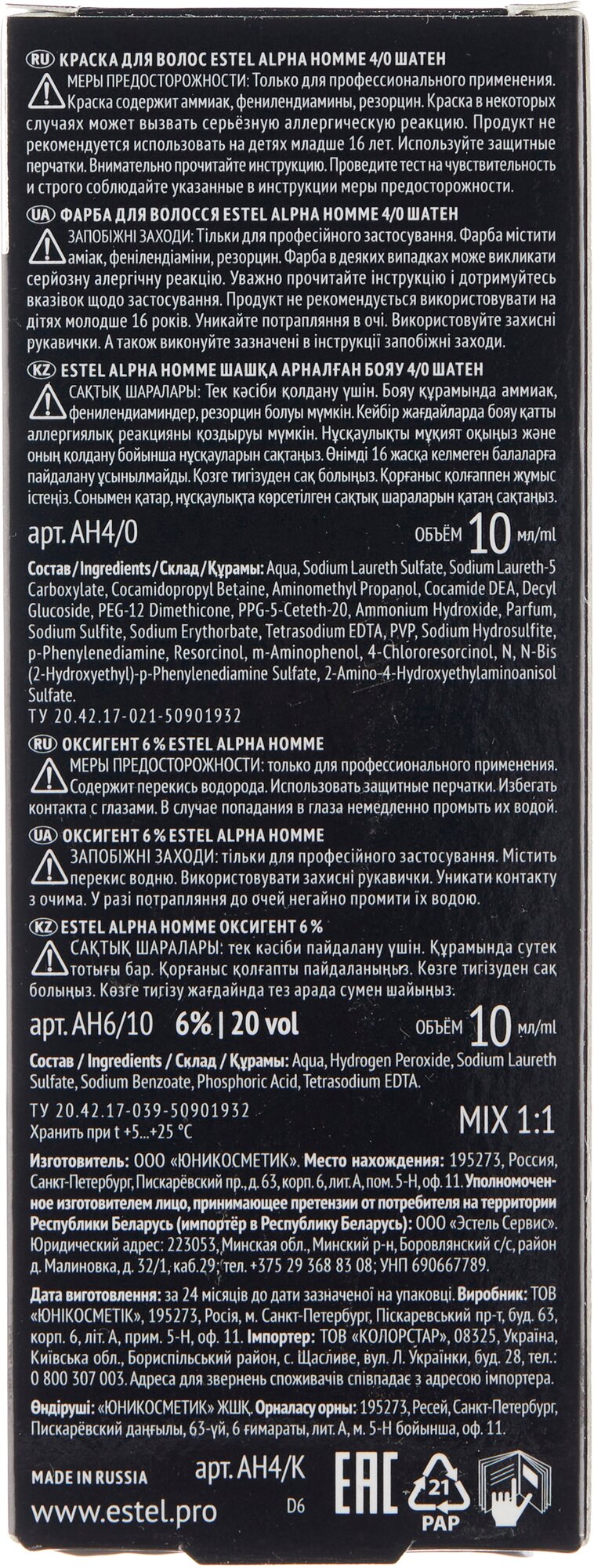 | Способ применения | пропорция смешивания 1:1. Во флаконе-пенообразователе объедините выбранный Вами оттенок краски Estel Alpha Homme и оксигент Estel Alpha Homme. Смешайте до однородной массы, вращая флакон по часовой стрелке. Не рекомендуется стряхивать во избежание образования пены во флаконе. Нанесите приготовленную смесь на волосы и равномерно распределите. Используется на влажных волосах. Применение на сухих волосах возможно, если есть желание получить цвет более плотный или максимально покрыть седину более 50%. Время выдержки от 5 до 10 минут в зависимости от структуры волоса. При стекловидной седине время выдержки 10 минут. Цвет красящей смеси при приготовлении и нанесении может отличаться от цвета заявленного тона |