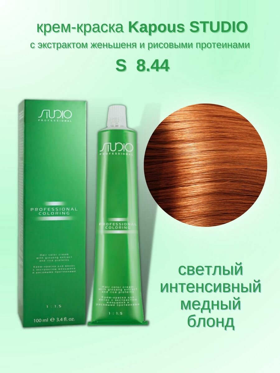 Купить Kapous Studio Professional Крем-краска для волос Studio, с рисовыми протеинами и экстрактом женьшеня, тон №8.44, Светлый интенсивный медный блонд, 100