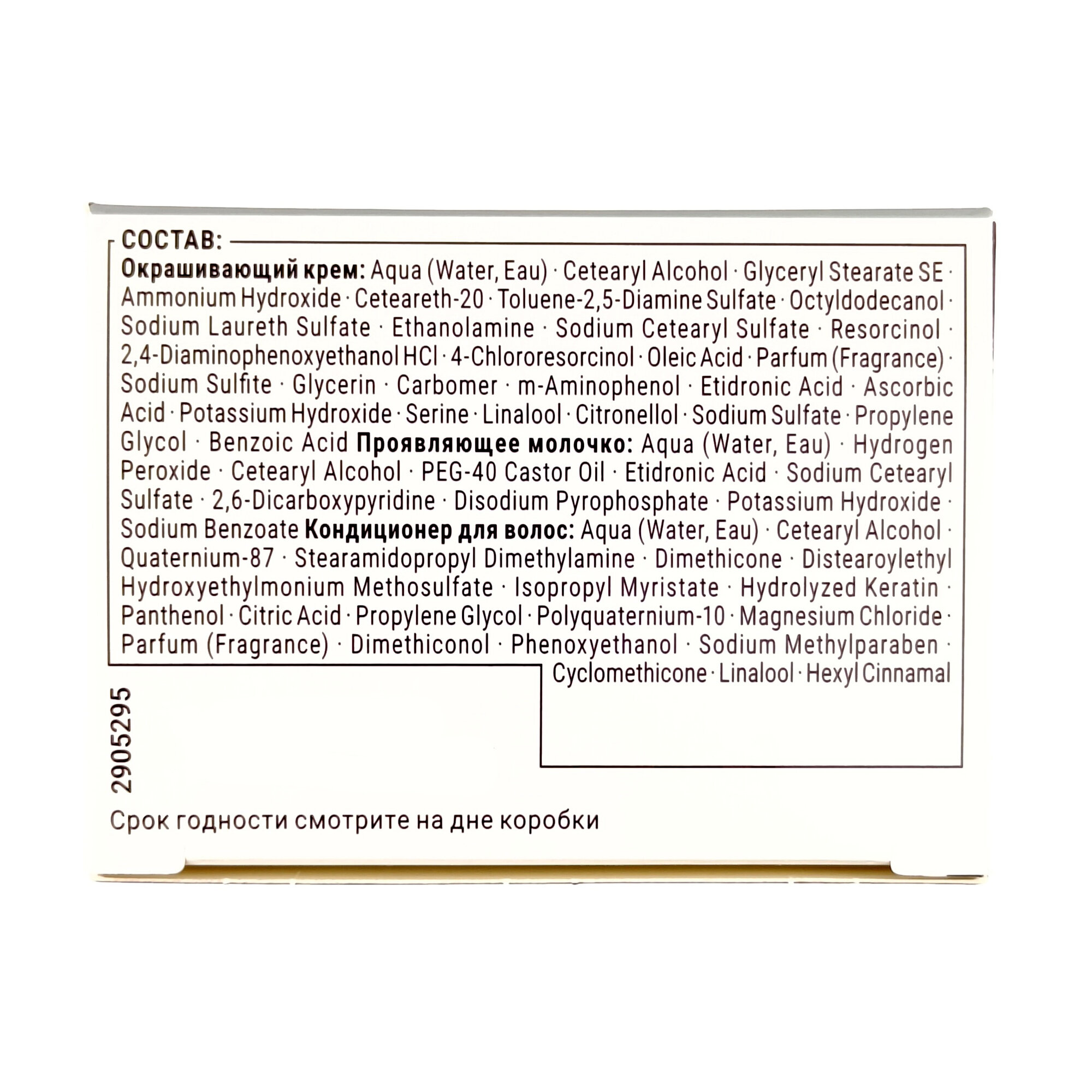 | Комплектация | окрашивающий крем - 50 мл, проявляющее молочко - 50 мл, кондиционер - 15 мл, 1 пара перчаток, инструкция по применению |